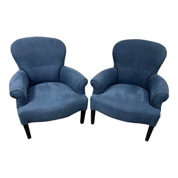 Design Plus Gallery presents a Pair of Blue Linen Club Style Arm Chairs from Cisco Brothers. Traditional styling with rounded arms and seat back with a gently curved seat will back this an elegant seating duo in any placement in your home. Some wear is on the fabric, small stains and fading but overall good condition.