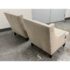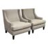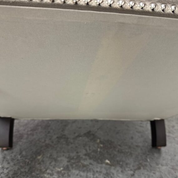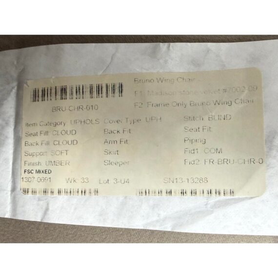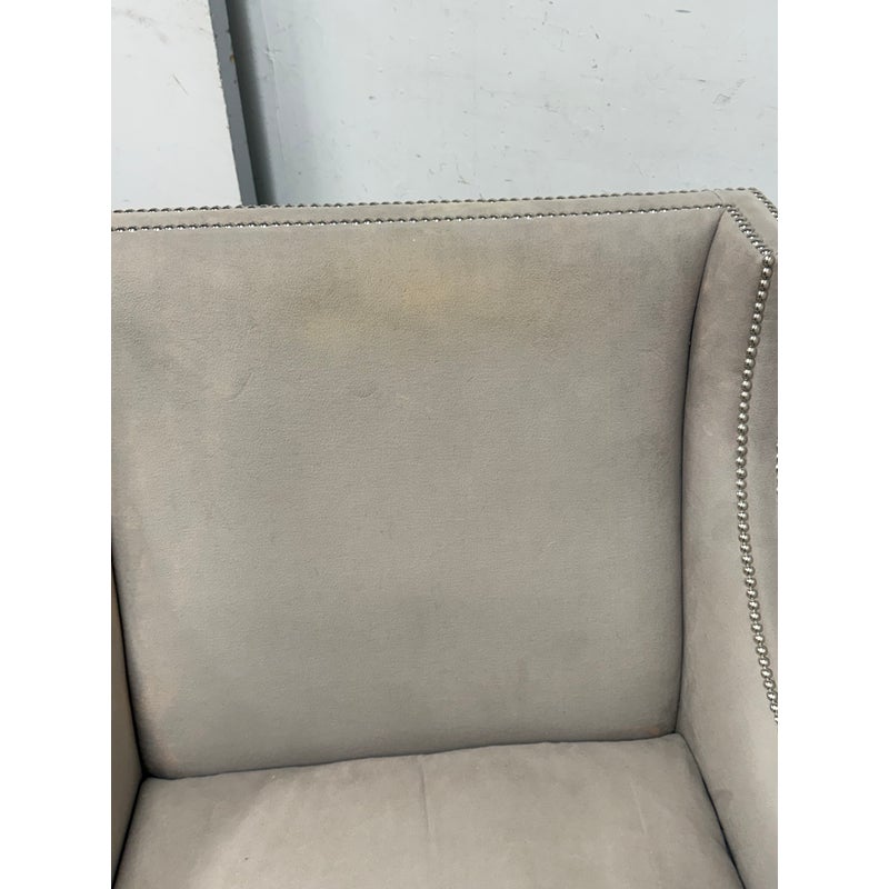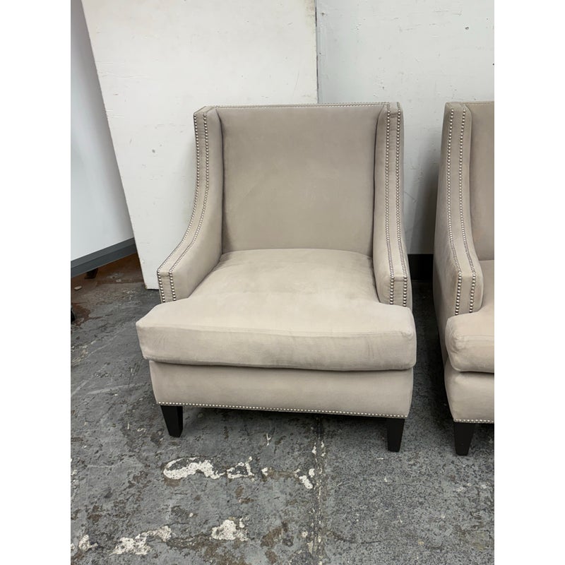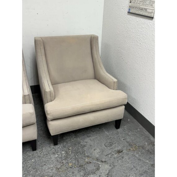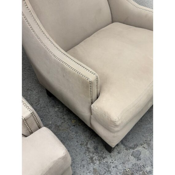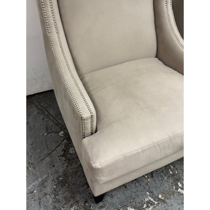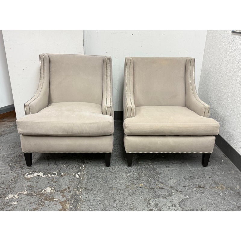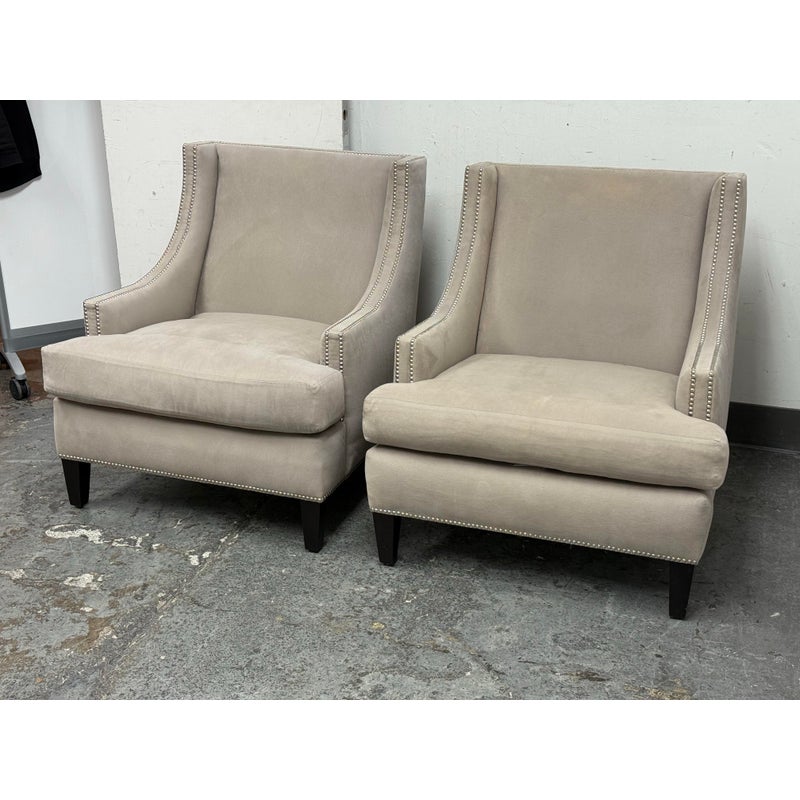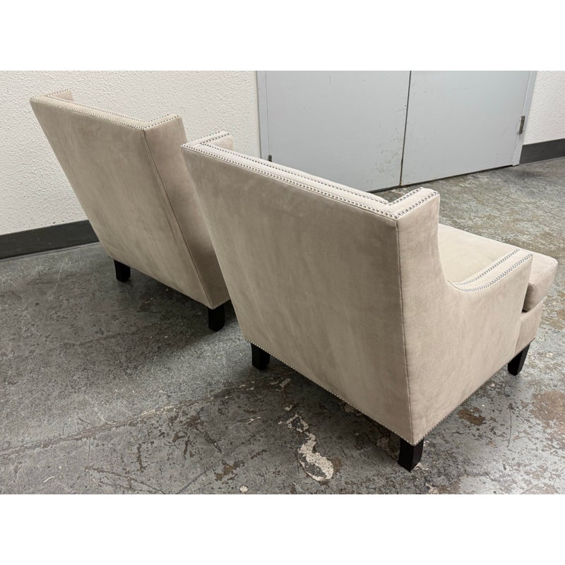 Design Plus Gallery presents a Pair of Bruno Wingback Chairs from Cisco Brothers. Talk about glamour, these chairs have it all with style along with substance. The upholstery is their premium Madison Stone velvet that is so soft and supple to the touch. The frames of the chairs are connected with the upholstery with shiny silver nail heads and the only exposure of the frame is on their dark mahogany stain. Single seat cushion is removable for cleaning and filled with the Cloud fiber. Their style is longer in production by the manufacturer. Both are in good condition with minimal signs of visible wear. One chair has discoloration on the seat backing.Both chairs would benefit wit a professional cleaning. Made in the USA.