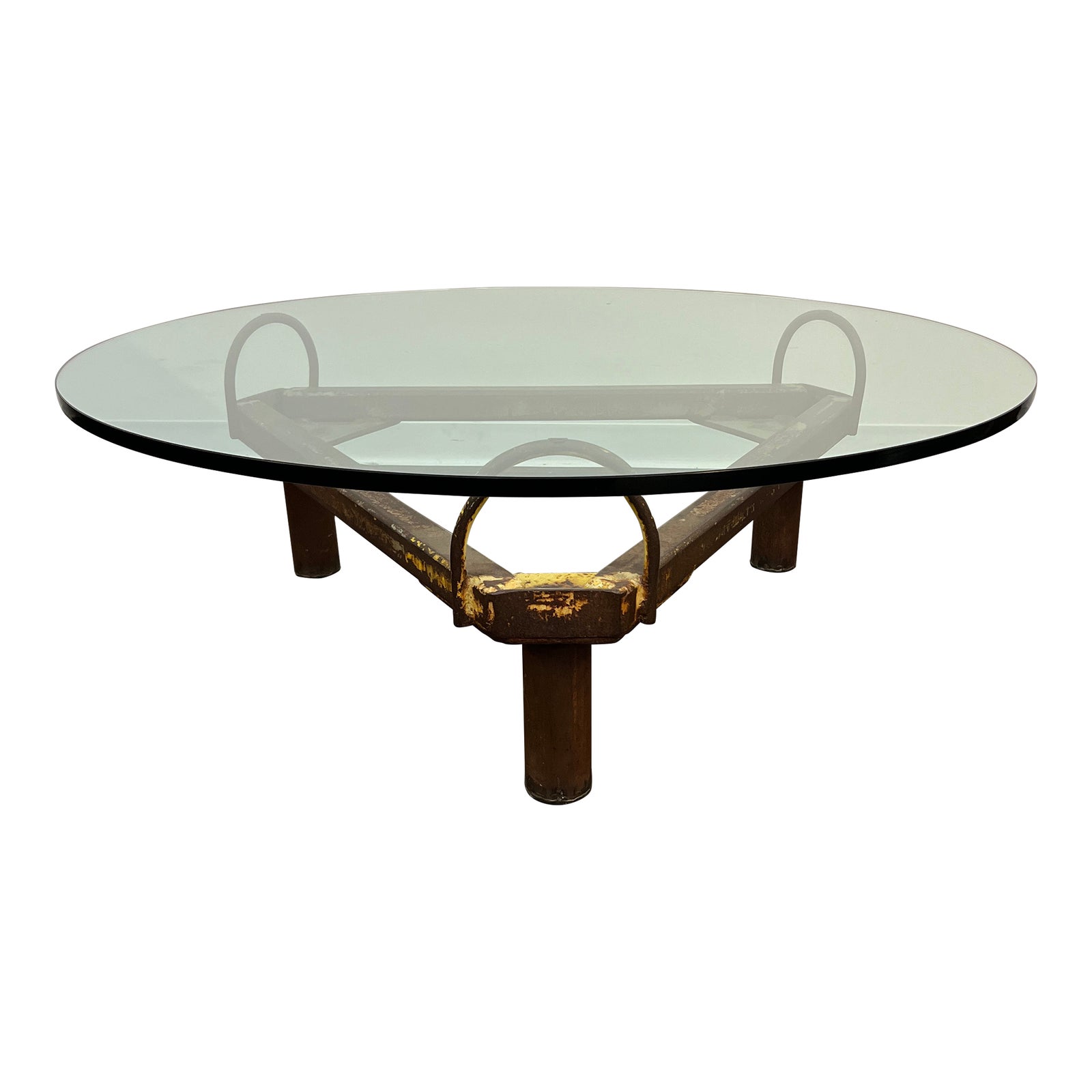 Design Plus Gallery presents a Custom Coffee Table by Cisco Brothers. A combination of a sleek modern design with a touch of rustic charm. This coffee table features a triangular metal frame, with one arch on each point, creating a striking and unique silhouette. The metal frame is naturally distressed, with varying shades of brown and hints of yellow distress, adding character and depth to the piece. The round glass top is sits the metal frame, showcasing the industrial aesthetic of the table. Whether placed in a modern loft or a cozy rustic cabin, this coffee table is sure to add style and sophistication to any space. Visible and minor wear. This is a discontinued model. Made in Los Angeles, California, USA.
