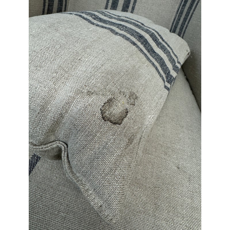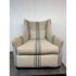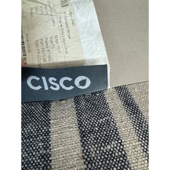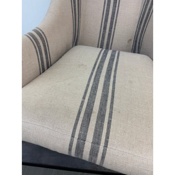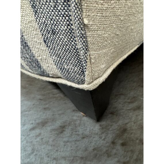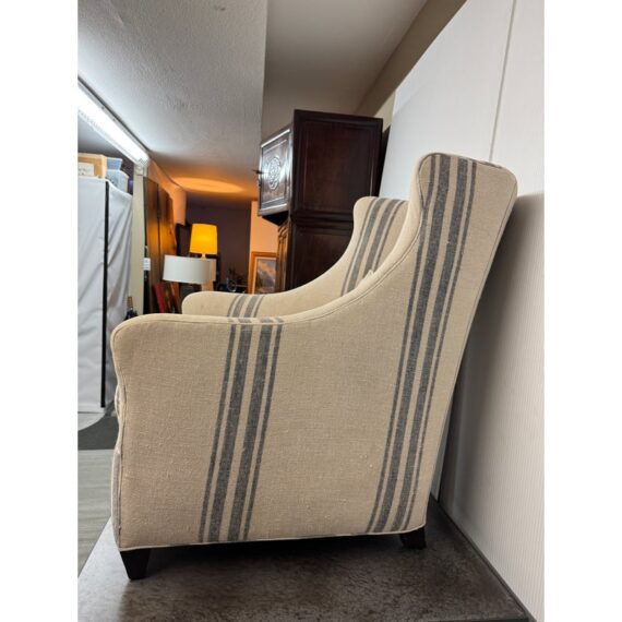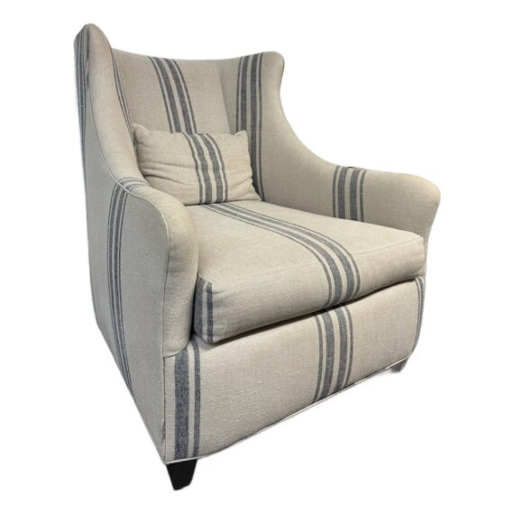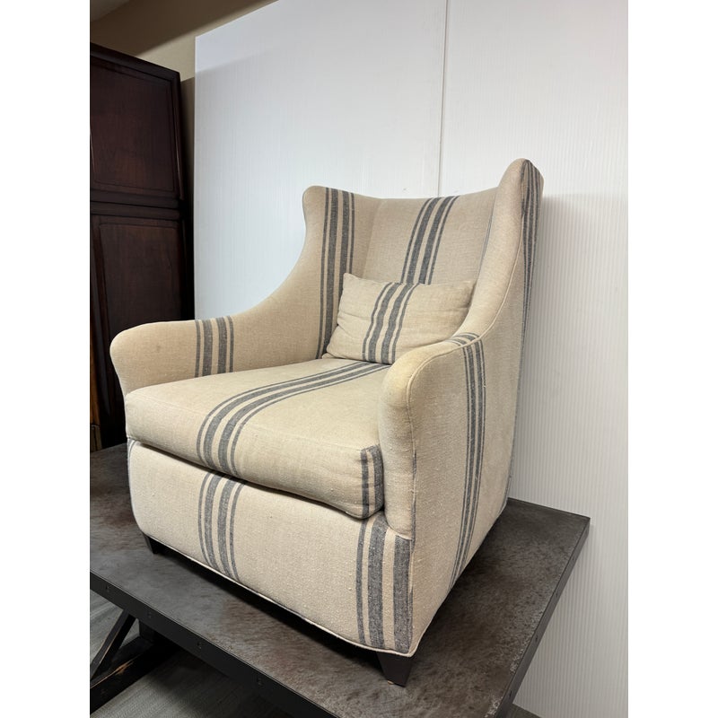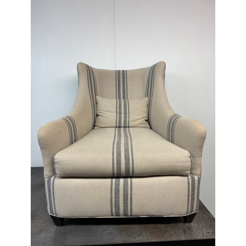 Design Plus Gallery presents the Lloyd Arm Chair from Cisco Brothers. The chair has a gentle silhouette and is draped in a coastal style textile called Newport Stripe that is navy and with an off white or natural background. Elevated slightly on espresso tapered wood feet. There is visible wear but overall is considered to be in good condition. Made in USA.