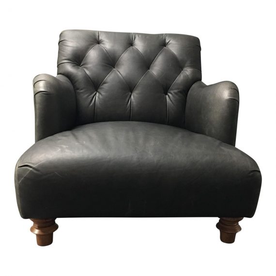 Design Plus Gallery has a Cisco Furniture Acacia arm chair. This big comfy chair is upholstered in a warm Charcoal color Leather. The chair is enhanced with tufting on the back which adds loads of character to the chair. This piece sits on turned bun shaped feet that are finished in a warm honey color.
