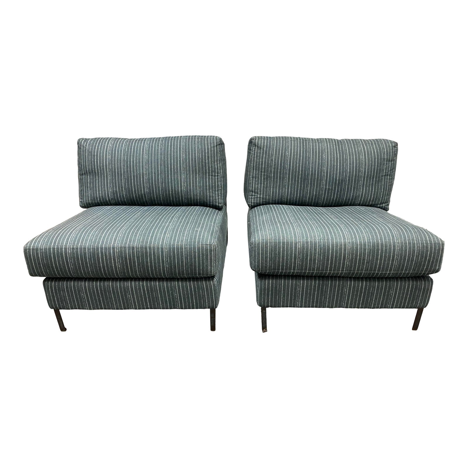 Design Plus Gallery presents a pair of Cisco Sunrise Home Slipper Chairs. Custom made with a durable Viridian Green + Ivory pinstripe fabric reminiscent of a Belgium Linen. Removable back and seat cushions are down filled around a high density foam core. Legs are a simple thin profile metal. Condition is excellent. Small scale and excellent Los Angelos manufacturing make for easy additions for any space needing low profiled guest seating. Custom designed at Sunrise Home in Mill Valley, California. U.S.A.