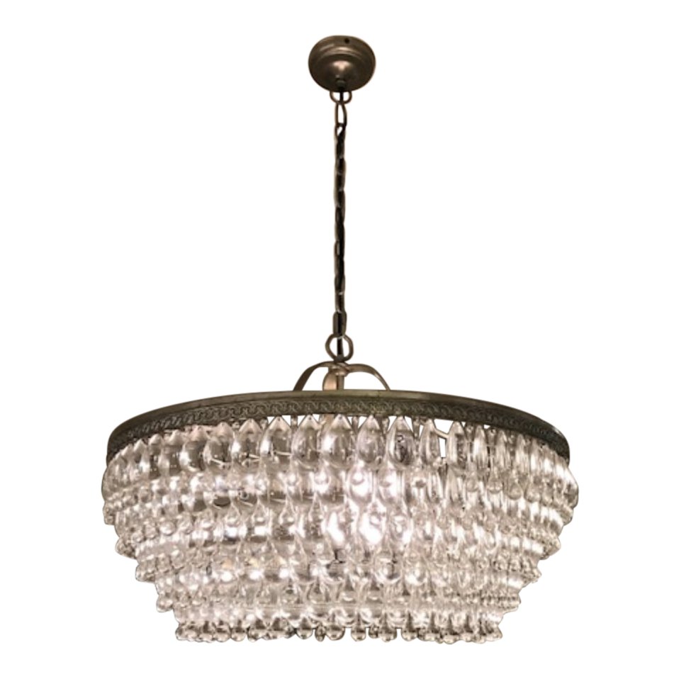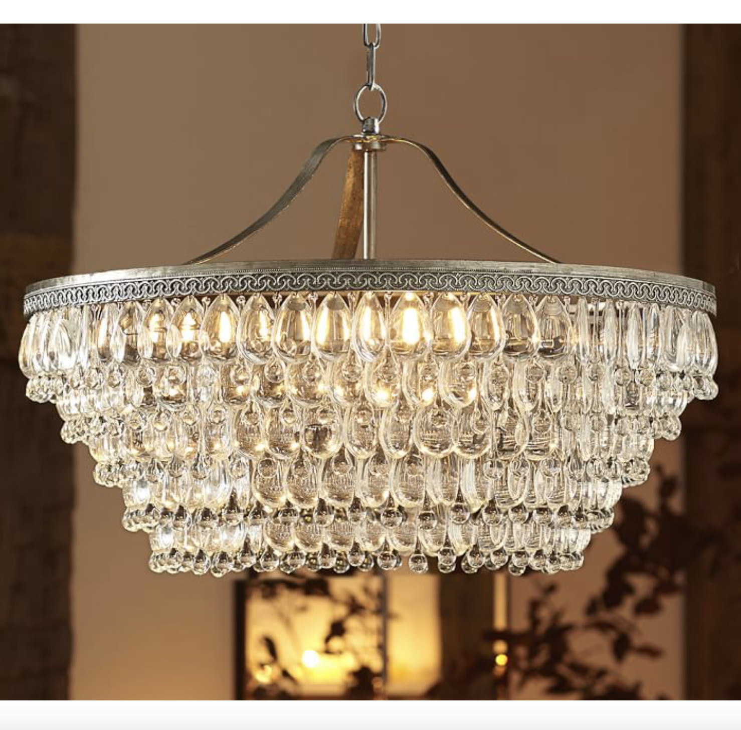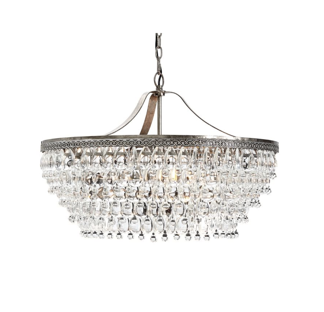 Design Plus Gallery presents the Clarissa Chandelier by Pottery Barn. Hundreds of glass droplets in alternating teardrop and raindrop shapes circle are suspended from embossed antiqued-silver rings. Dimmer switch compatible for the perfect ambiance.