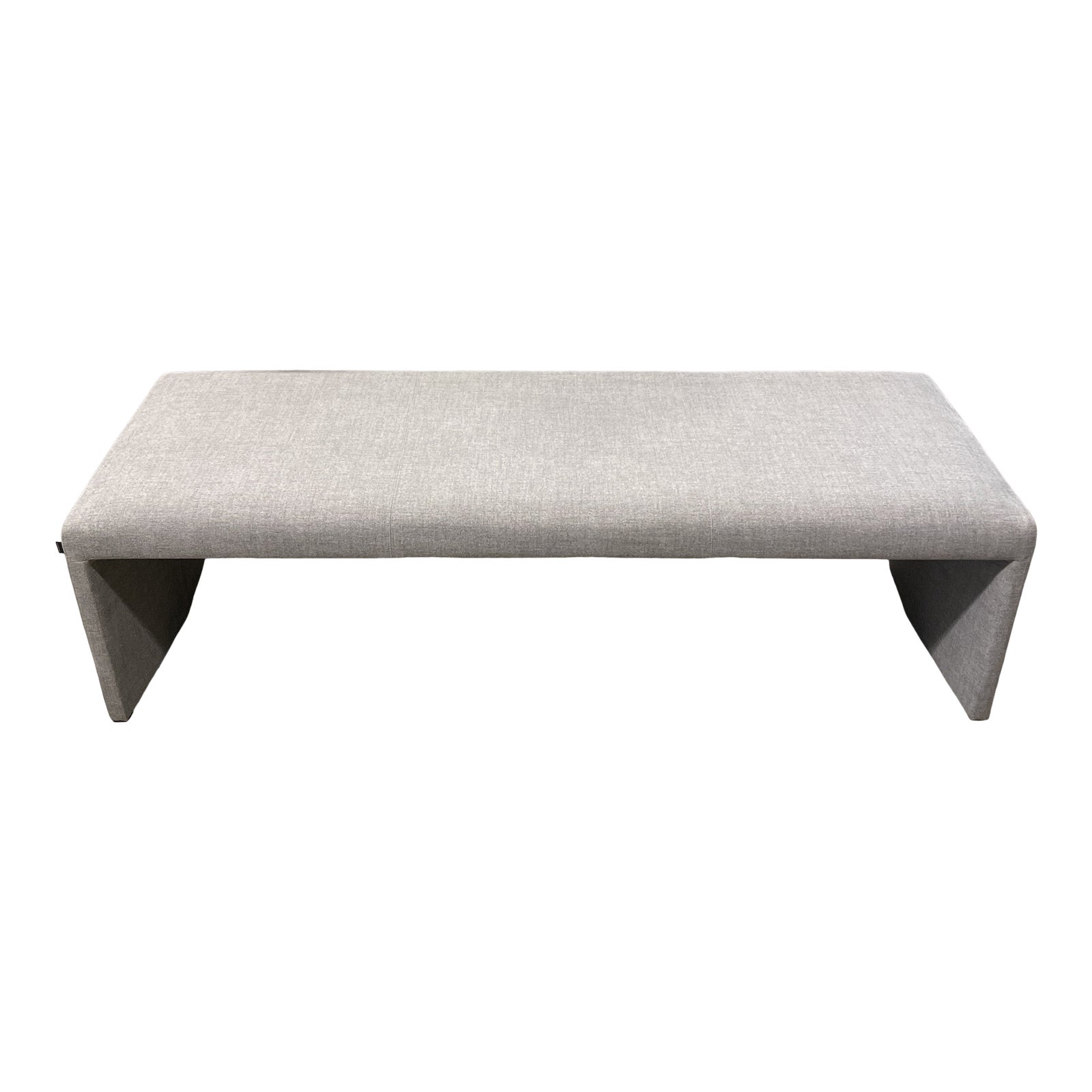 Design Plus Gallery presents a Coalesse Custom Micro Fiber Grey Bench. Thin waterfall form is elegant and modern. Softly upholstered with a contract graded grey micro fiber that can blend with many color schemes. Visible wear through out, including the base. Bench is in good condition. Made in Mexico.