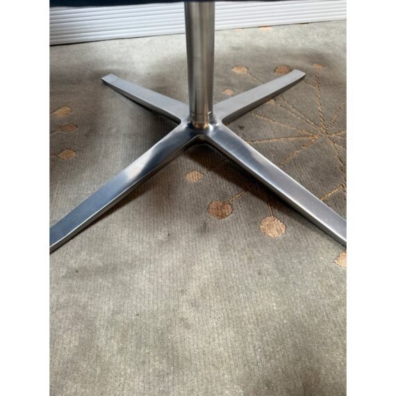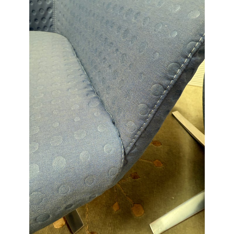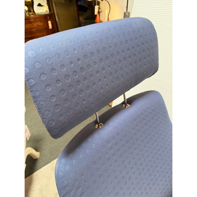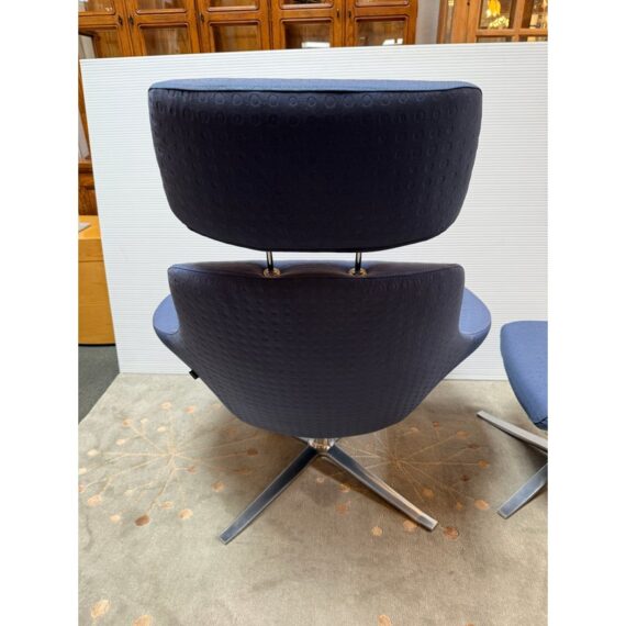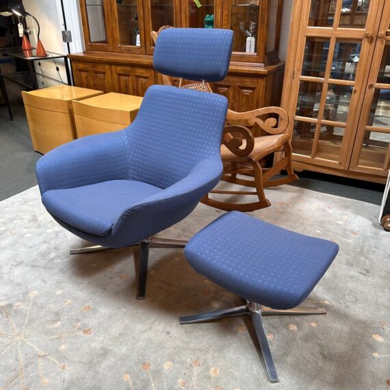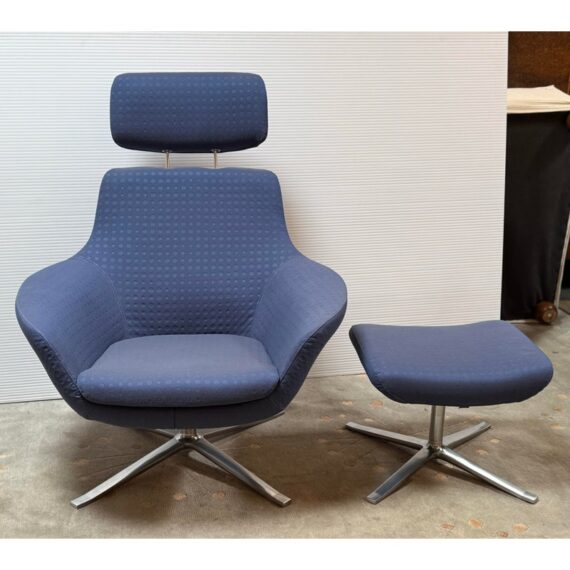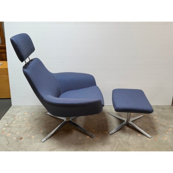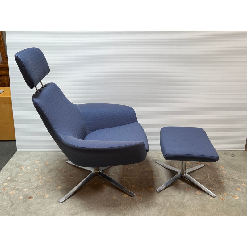 Design Plus Gallery presents a Bob Lounge + Ottoman by Coalesse by Steelcase. A well-crafted and comfortable lounge chair with flared arms, eight-adjustable tilt headrest and swiveling matte polished aluminum base. Upholstered in a durable blue dot Jacquard fabric and matched with a coordinating ottoman, the Bob Lounge is well-suited to any home or professional space. In good condition, light surface wear.