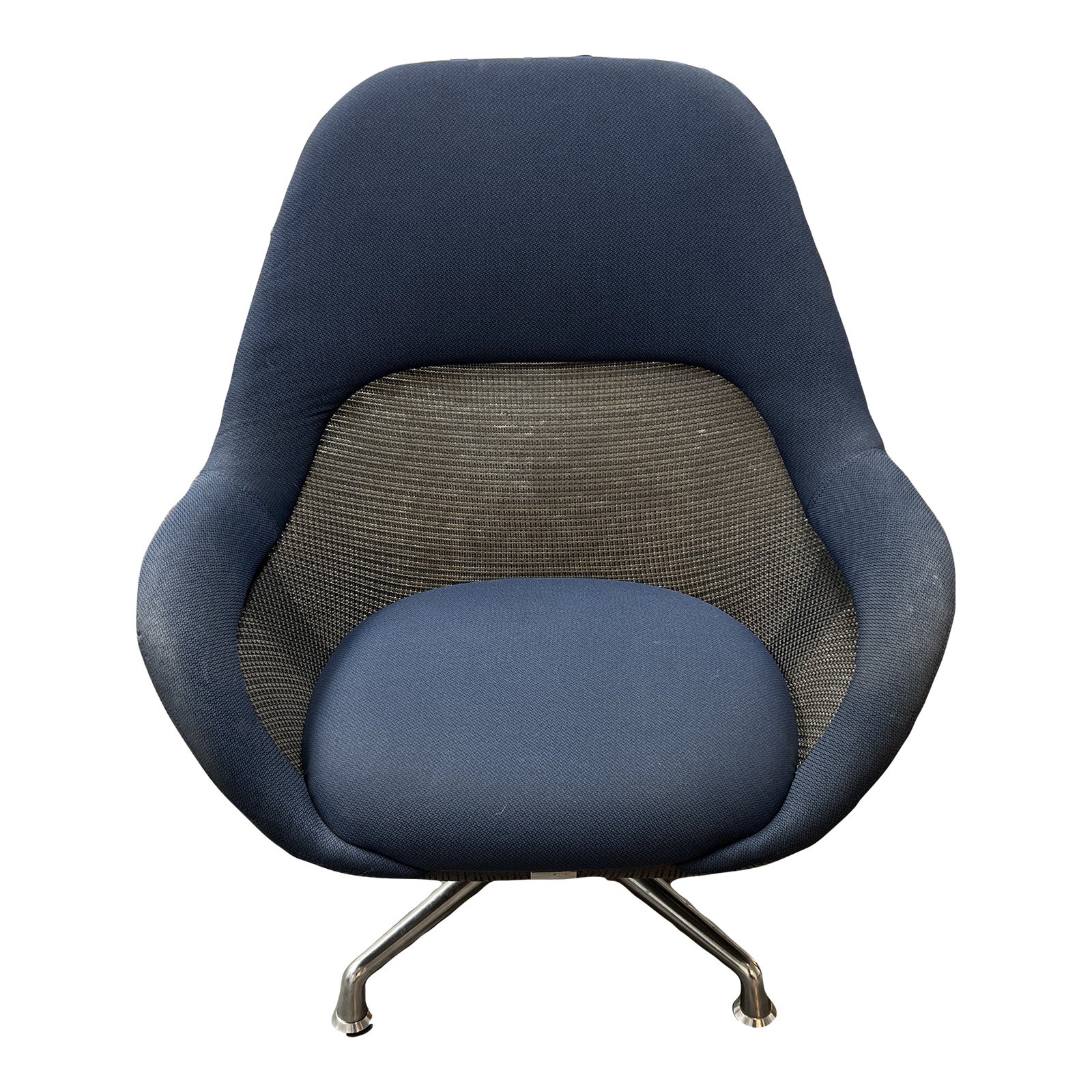 Design Plus Gallery presents the SW_1 Collection Conference Chair, by Coalesse. Features include a knit back for breathability, cushions that can be reupholstered, and a four-star base constructed with aluminum. The chair swivels and has a mechanism to return to its natural position. Upholstered in a blue fabric with miniature texture. Visible wear, needs cleaning; chair is in good condition.
