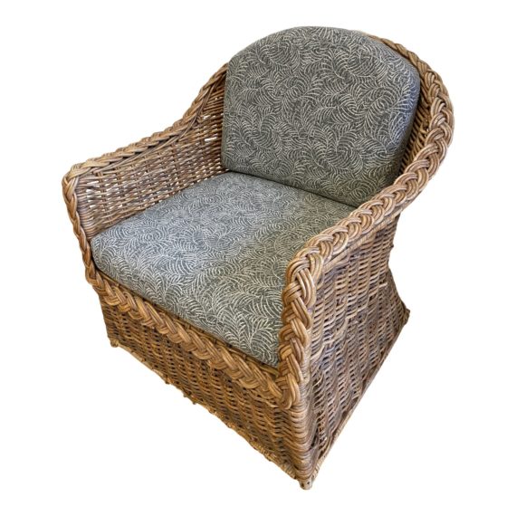 Design Plus Gallery presents a Coastal Style Wicker Chair. Beautiful braided edge details the gentle curved back. Neutral foam filled cushions invites relaxation.