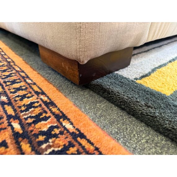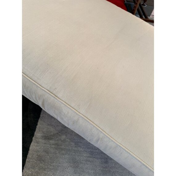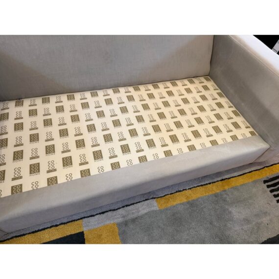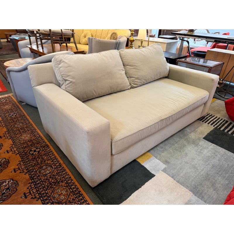 Design Plus Gallery presents the Durham Sofa from Cococo Home. This sofa offers a contemporary design that seamlessly fits into a variety of home decors, from modern to traditional. With its plush cushions and elegant silhouette, the Durham Fabric Sofa invites you to relax and unwind after a long day. Designed with both aesthetics and practicality in mind, the sofa is upholstered in Kravet Chenille upholstery in a taupe tone that is durable and easy-to-clean fabric, making it an excellent choice for busy households. There is discoloration to one side of the seat cushion and small nicks to the legs but overall in good condition for its usage. Made in the USA.
