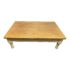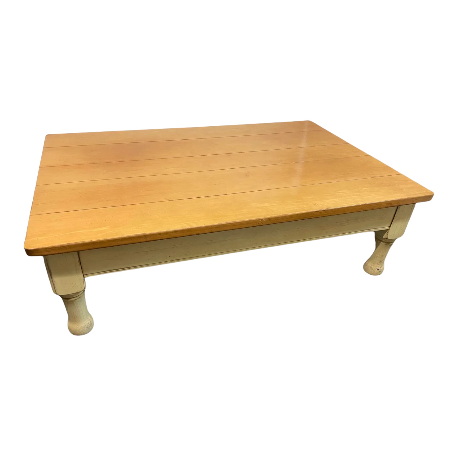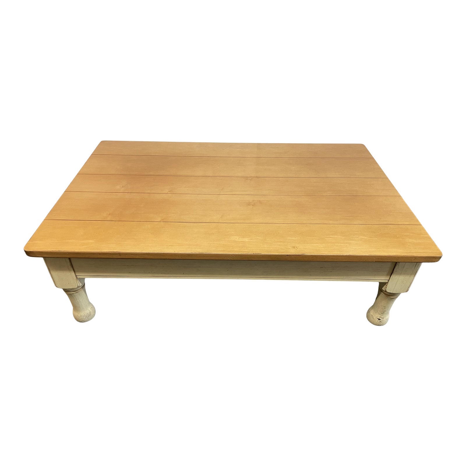 Design Plus Gallery presents the American Themes Coffee Table by Drexel. The large scale centerpiece is solid maple. The natural wood grain allowed to shine through on the wide plank top, and then complemented with a white-washed base with turned legs.