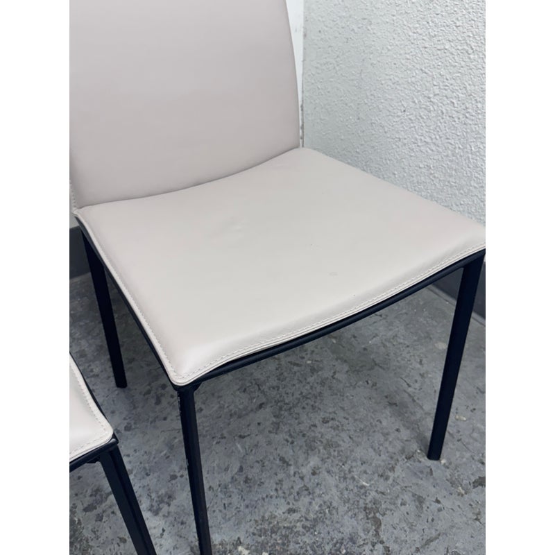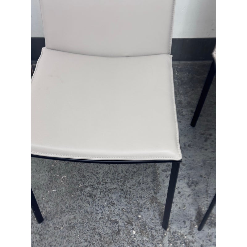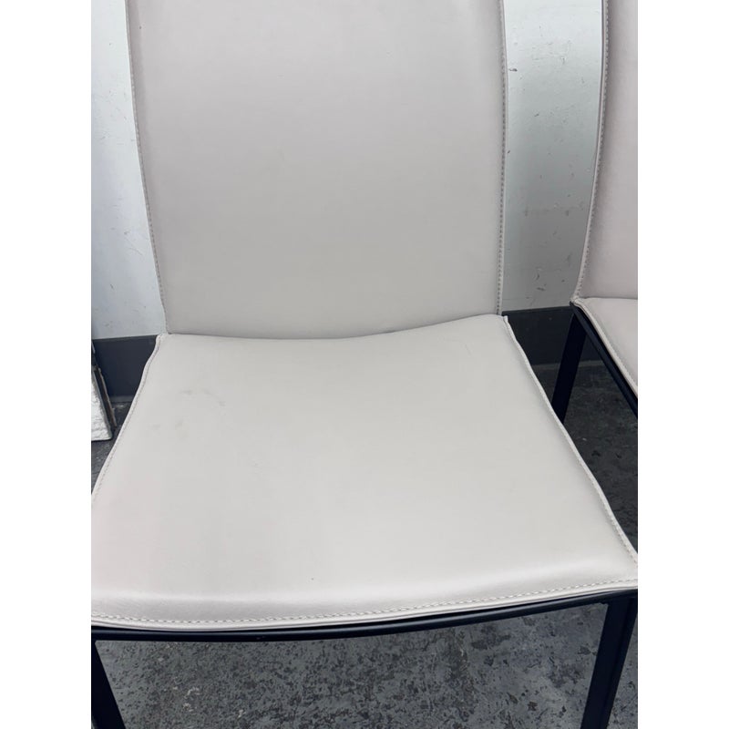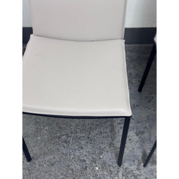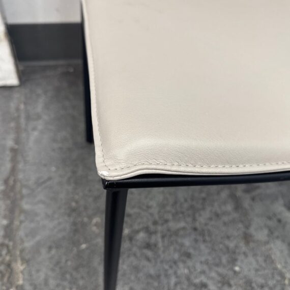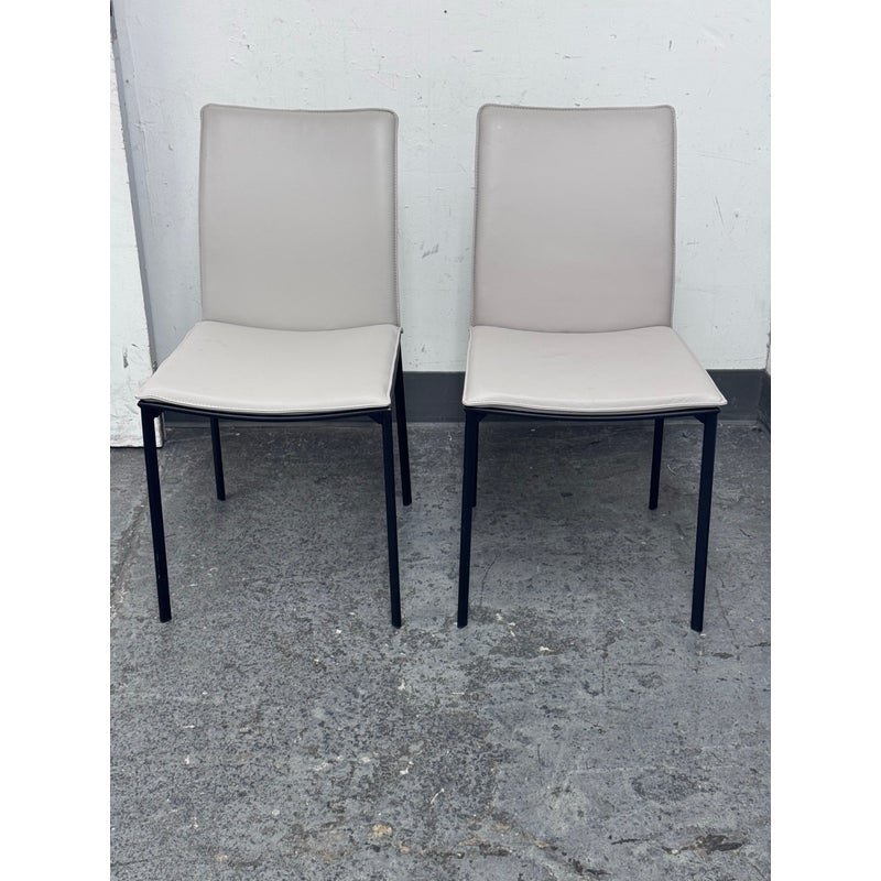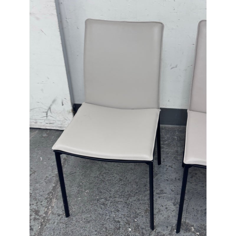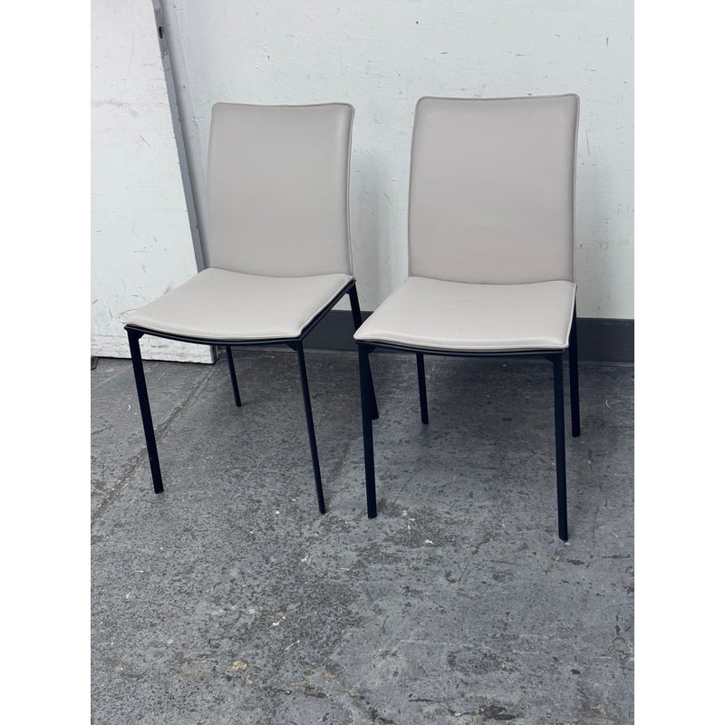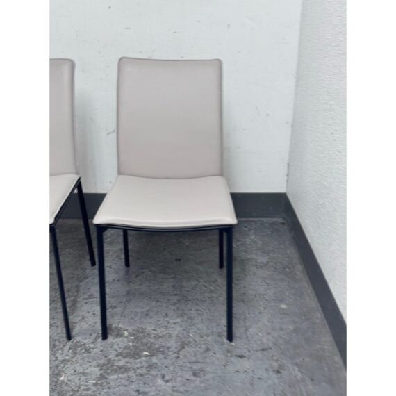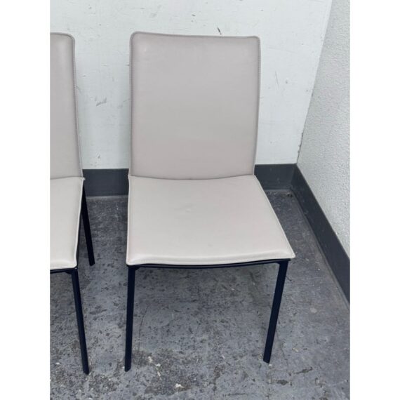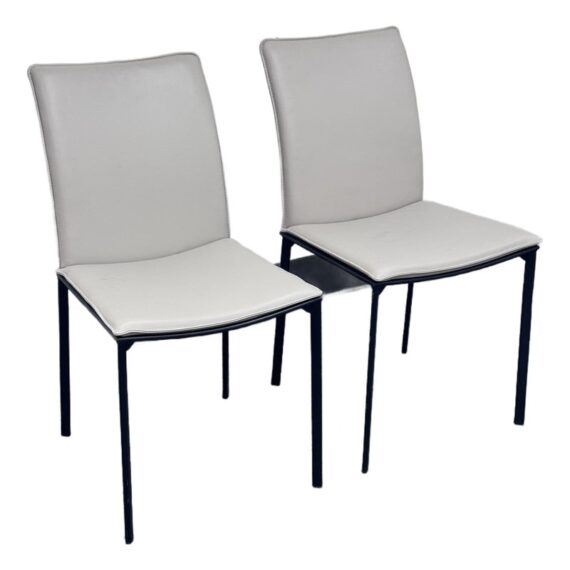 Design Plus Gallery presents a Pair of Olivia Leather Side Chairs from Colibri. Upholstered in gray leather, these chairs combine timeless elegance with contemporary flair. The sleek black-finished slender metal legs provide a modern contrast, enhancing the overall aesthetic while ensuring sturdy support. Crafted from premium materials, each chair offers exceptional comfort and durability, making them perfect for everyday dining or special occasions. Their refined design seamlessly blends classic sophistication with inviting comfort, creating a stunning impression in any interior. In good condition, visible and minimal wear form usage.