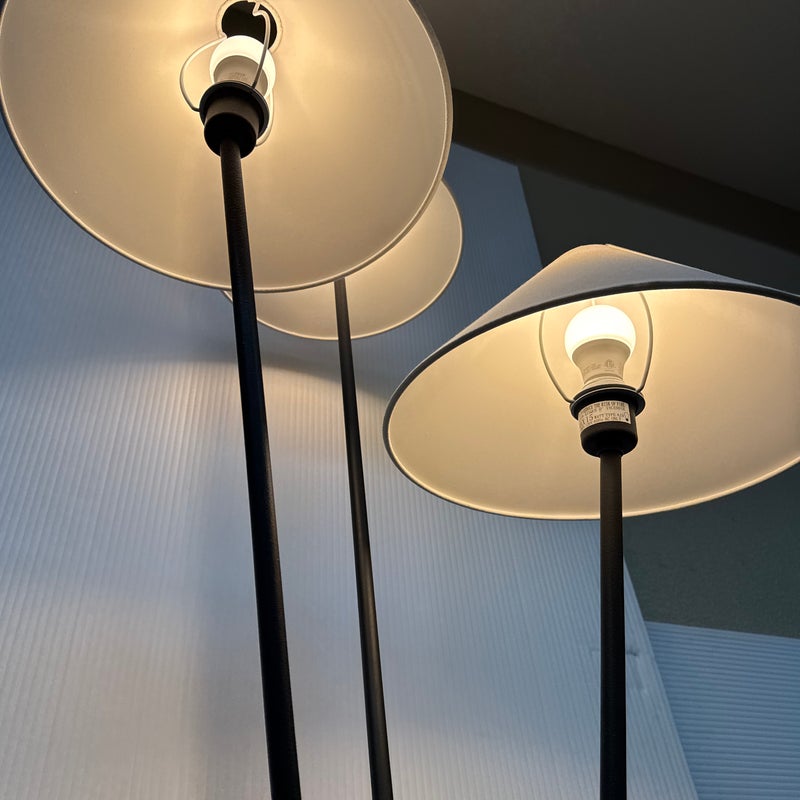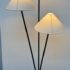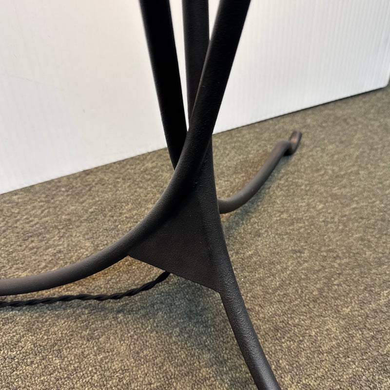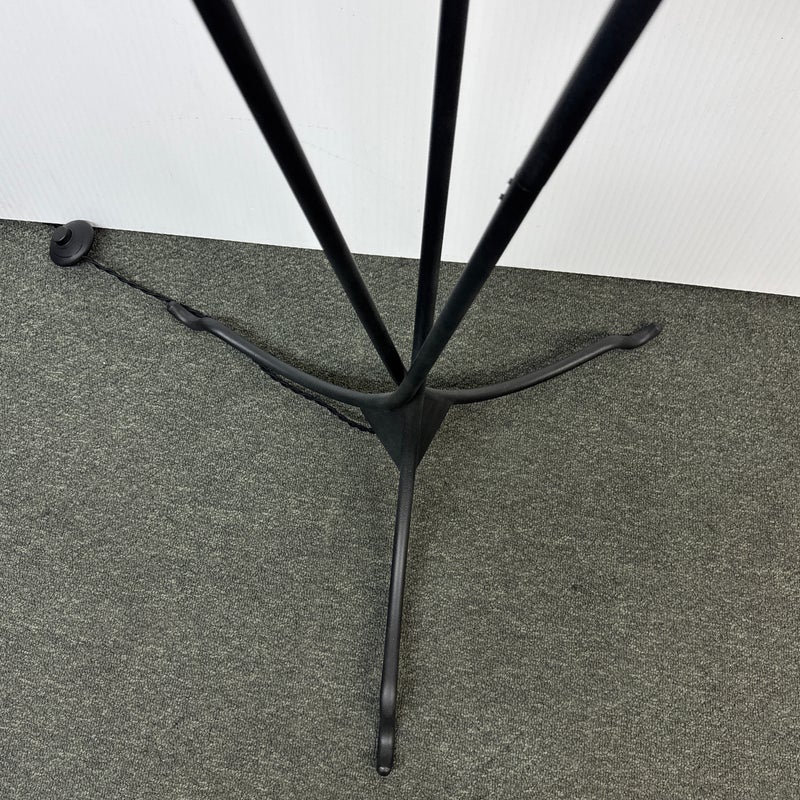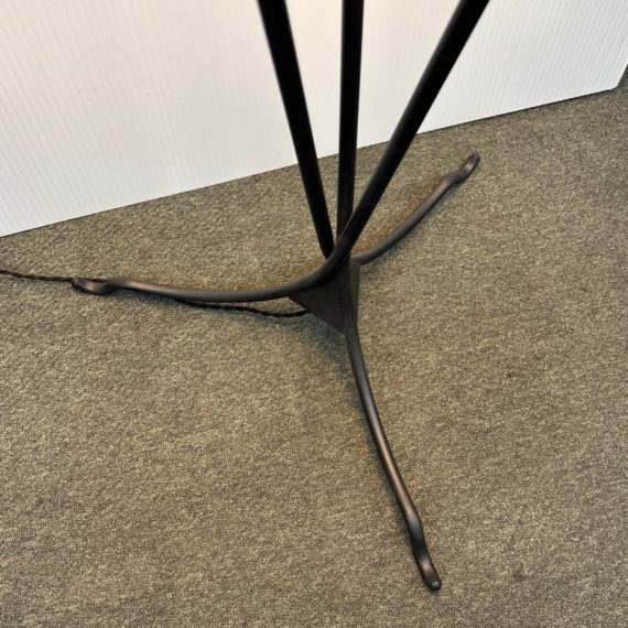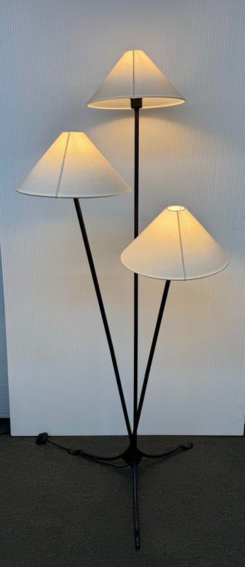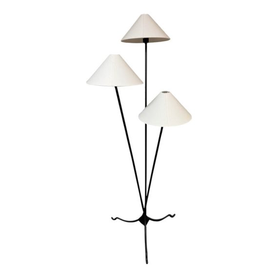 Design Plus Gallery presents a Cedar Floor Lamp by Colin King Studio for Troy Lighting. Sleek forged iron arms draw the eye to three tapered, off-white linen shades, creating a layered effect and giving Cedar its recognizable clean, modern silhouette. The floor lamp’s unique tripod base and wavy feet add a touch of softness and unexpected whimsy. In good condition, visible and minimal wear from usage.