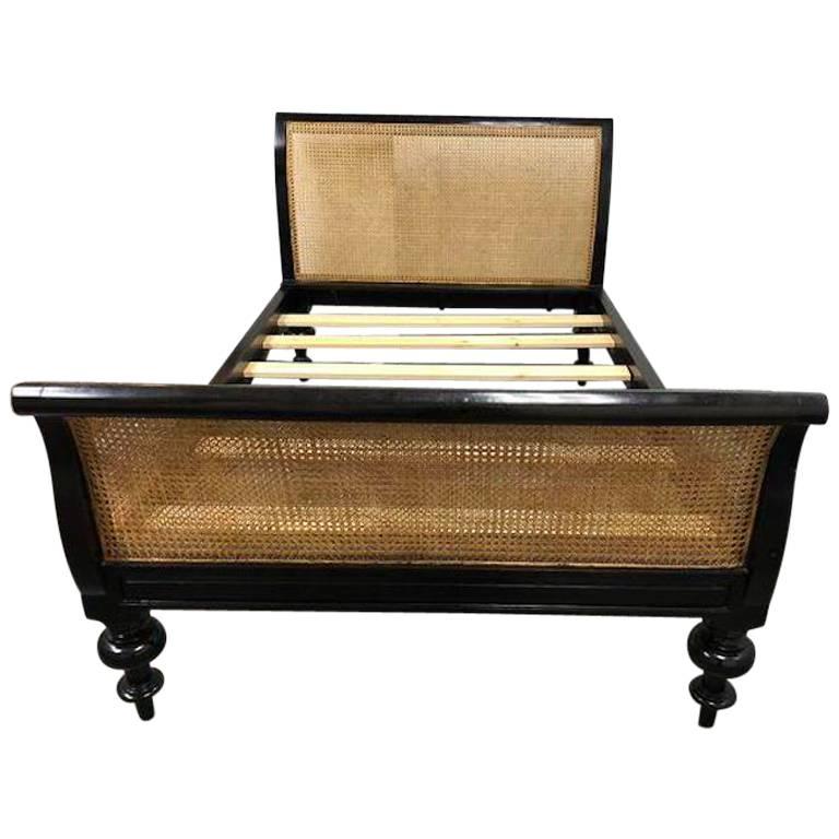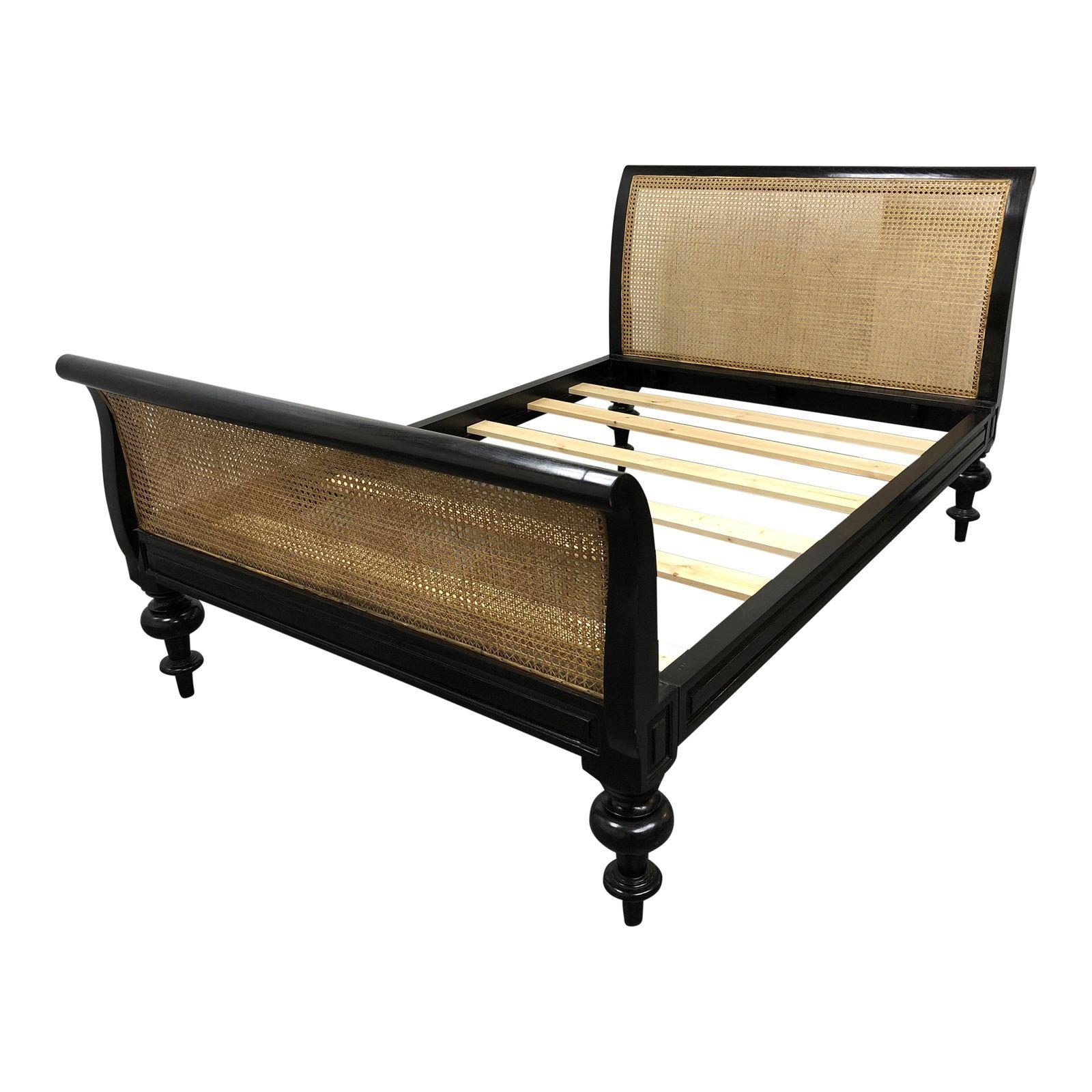 Design Plus Gallery presents a classic Colonial style sleigh bed, double. Featuring a caned headboard and foot board plus beautifully turned legs in ebonized teak. Slates are included. Height of the platform 16”H.