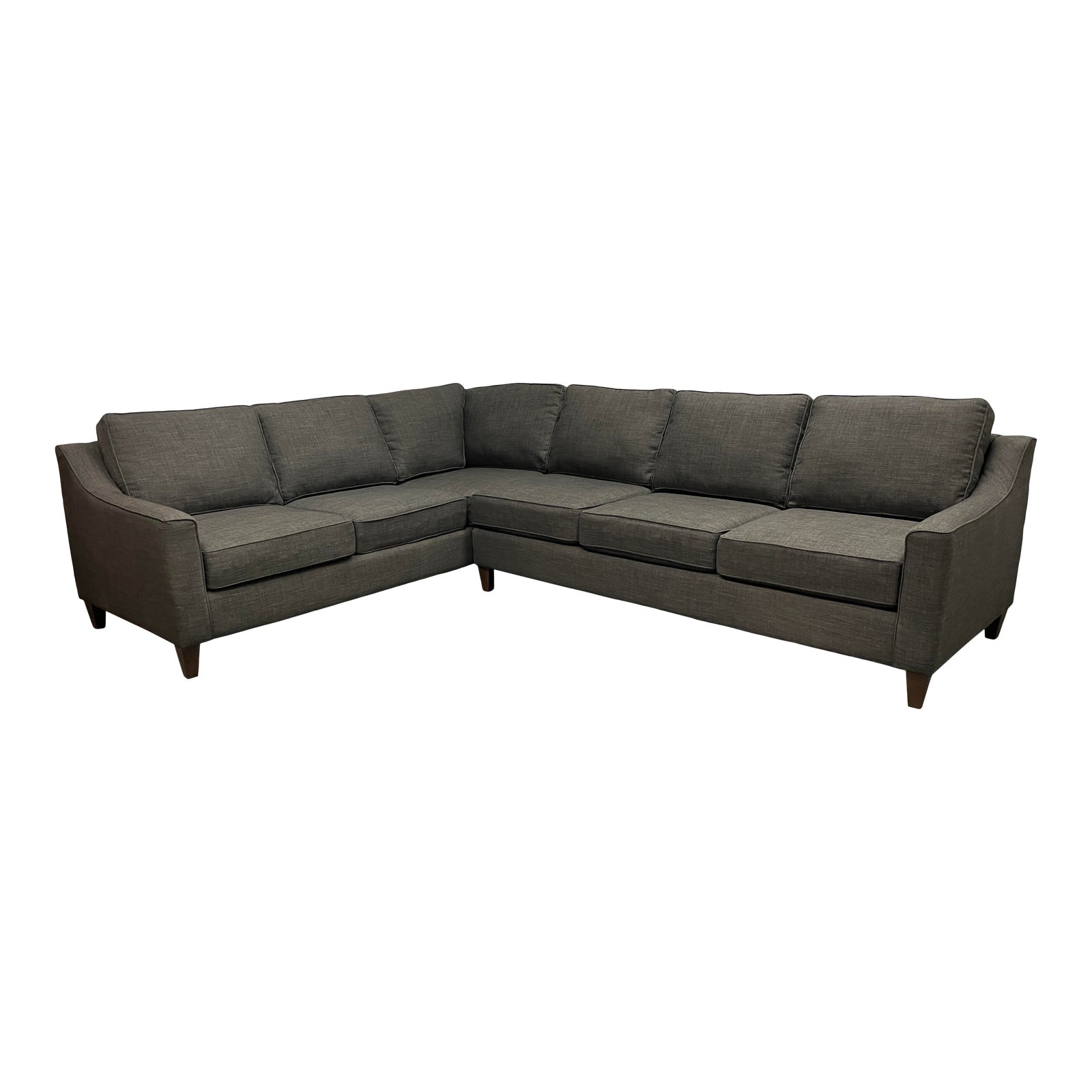 Design Plus Gallery presents a Two Piece Jesper Stationary Sectional Comfort Design Premier. Comfortable back cushions that stay firmly in place with hook and loop attachments, vertical seaming on cushions for a subtly tailored appearance, narrow sharkfin arms that slope upward to meet the back rail and tapered rails. Solid construction with sturdy steel springs and kiln-dried wood. Precision-cut materials for strength and durability. Upholstered in a gray fabric. Handcrafted in the USA of domestic and imported materials. Visible and minor wear from usage.