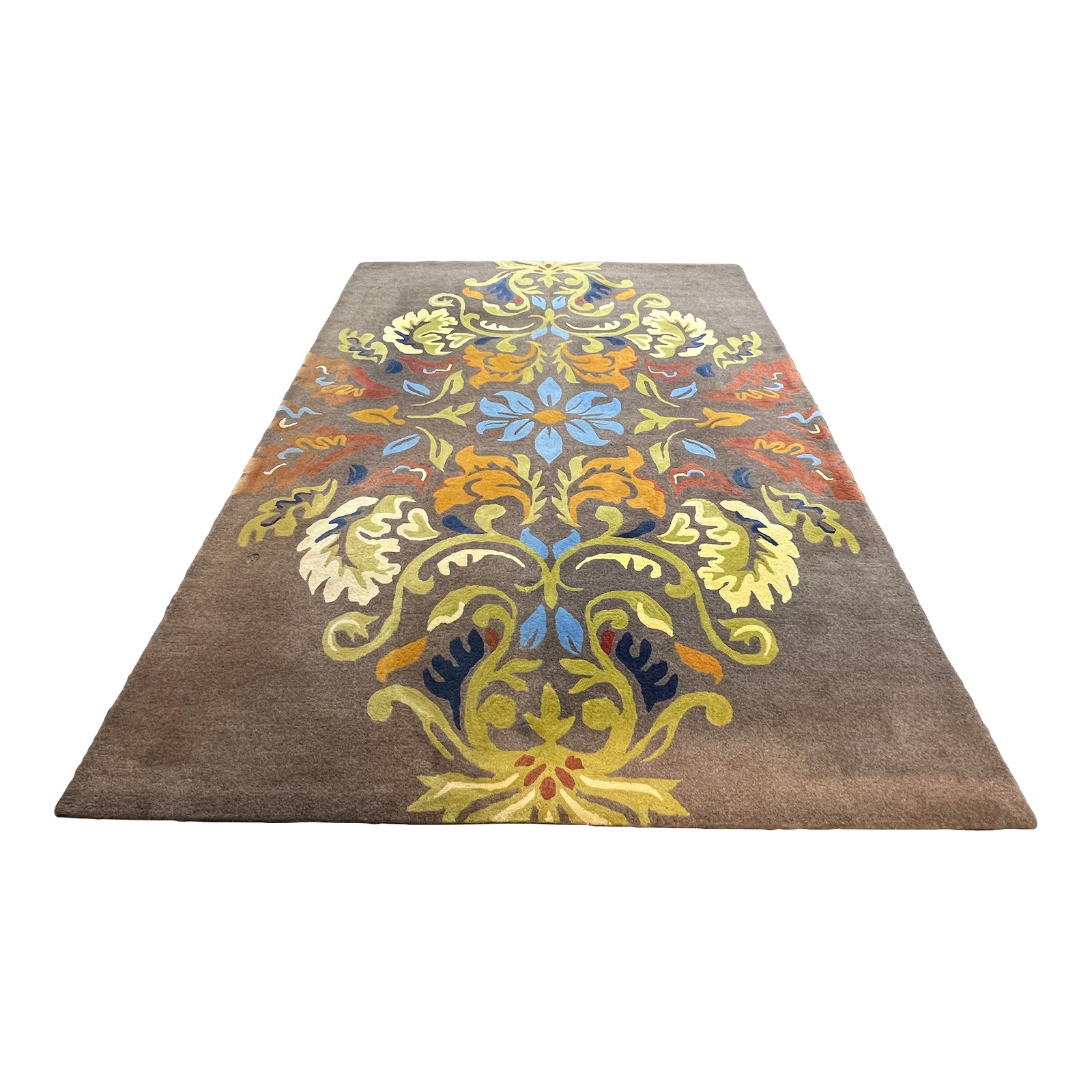 Design Plus Gallery presents an 8ft1in by 10ft11in Wool Pile Damask Rug by Company C. The rug is constructed with 100% wool. A multicolor damask pattern with botanical influences adorns the gray background and is doubly symmetrical. A flower with an orange center and blue leaves serves as the central accent. Minor wear consistent with use; rug is in good condition.