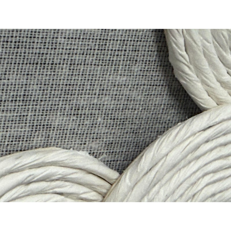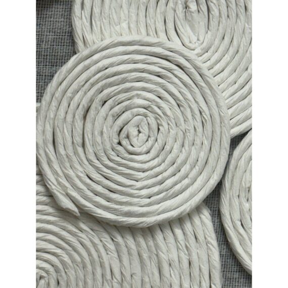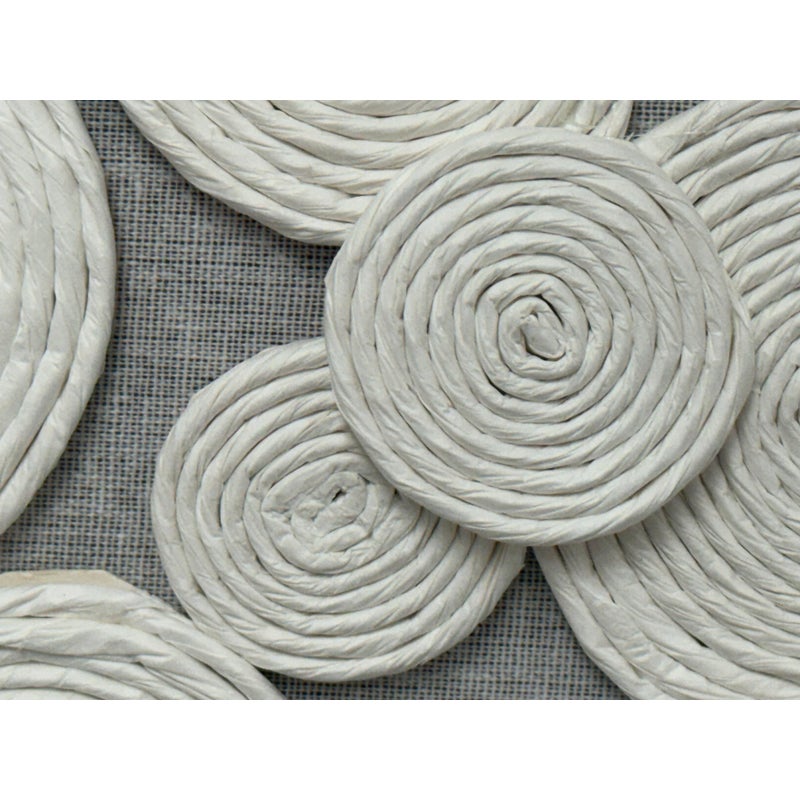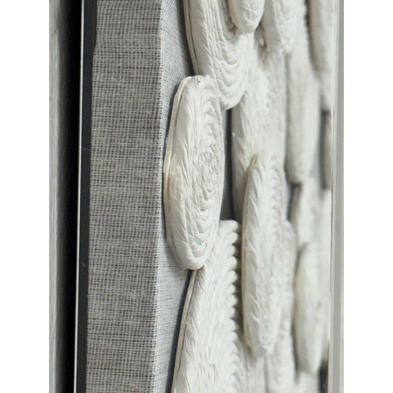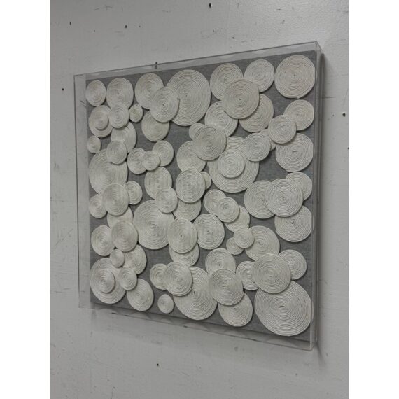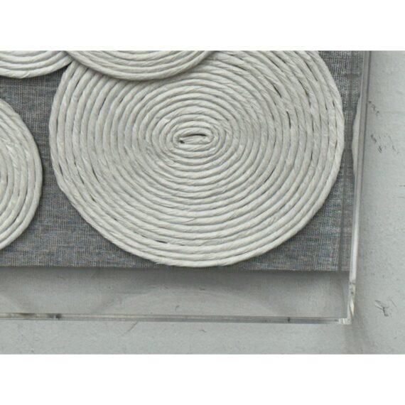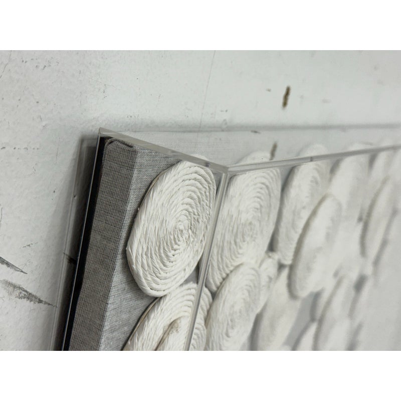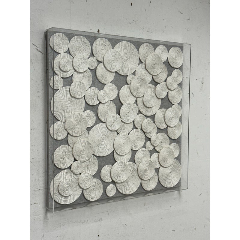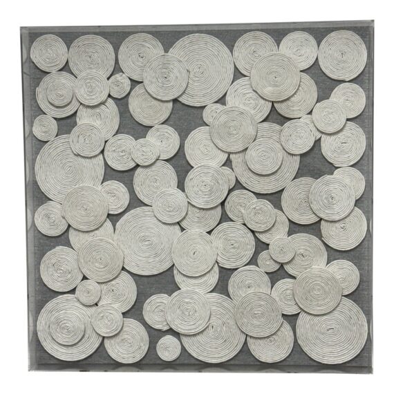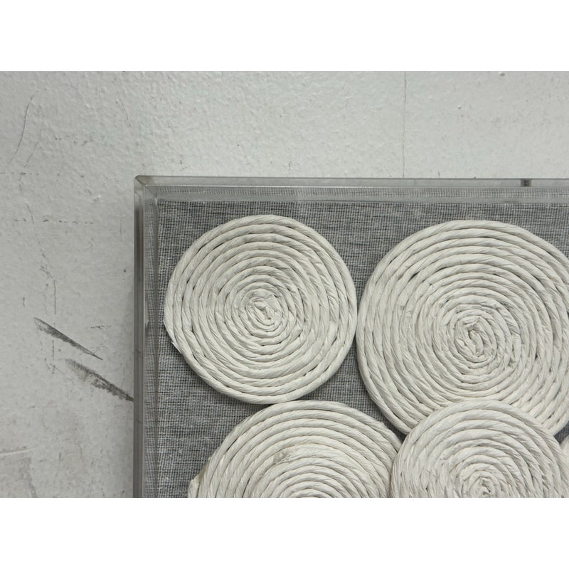 Design Plus Gallery presents a Wall Art of Concentric Textural Circles. The coiled material is likely of rope or yarn on a gray background enclosed in an acrylic frame. Overall the artwork is in good condition for its usage.