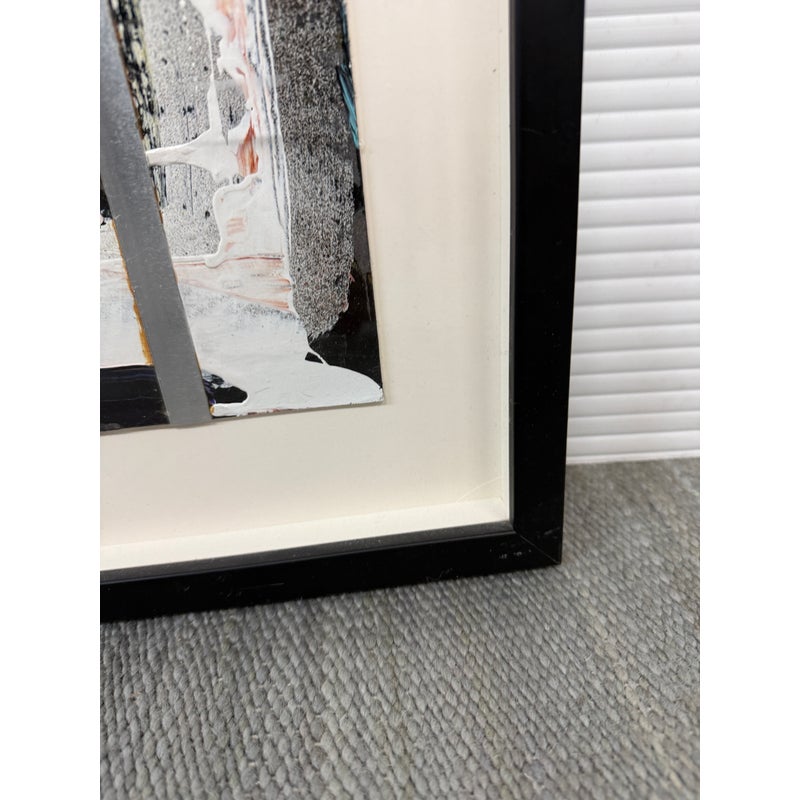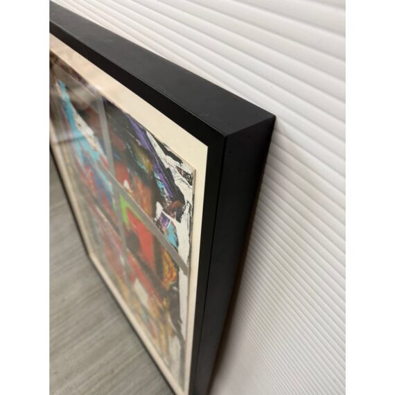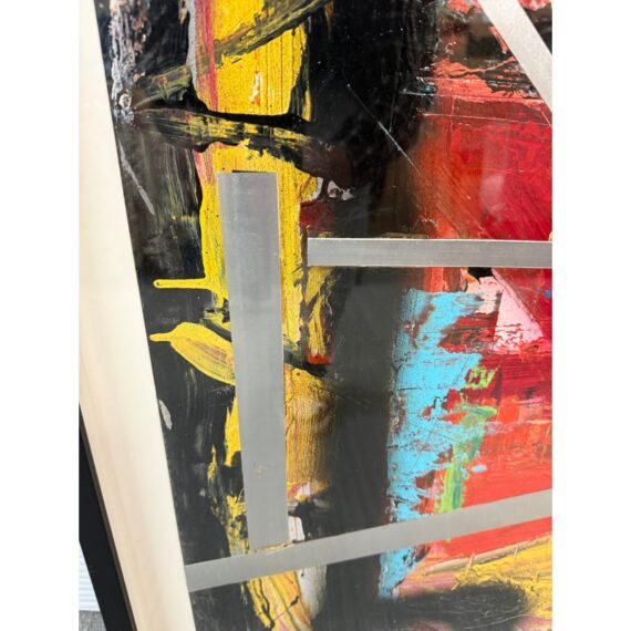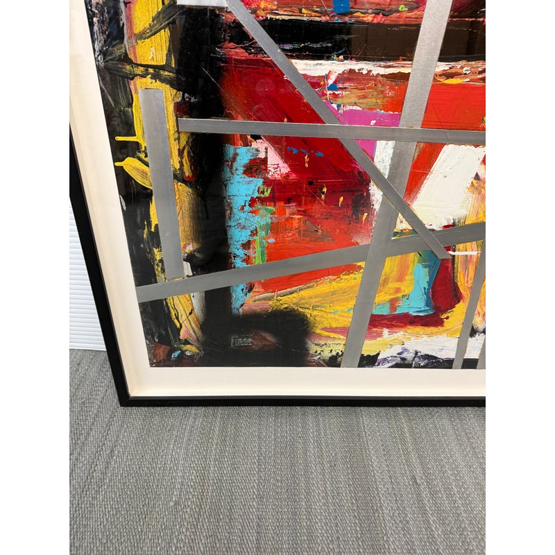 Design Plus Gallery presents an Original Abstract Mixed Media Artwork. Brilliantly colored and bold brushwork, this painting is strategically overlaid with silver tape. A focal point in any space. Condition is good.