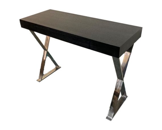 Design Plus Gallery presents a Contemporary X-Base Desk. X-shaped polished steel base supports an espresso stained wood surface. Space efficient size makes the desk easy to fit in almost any space and can double as a console table. Immediate visual interest with its decidedly modern appeal. Minor wear on surfaces. Two hidden drawers provide a bevy of concealed storage for office supplies and electronics.