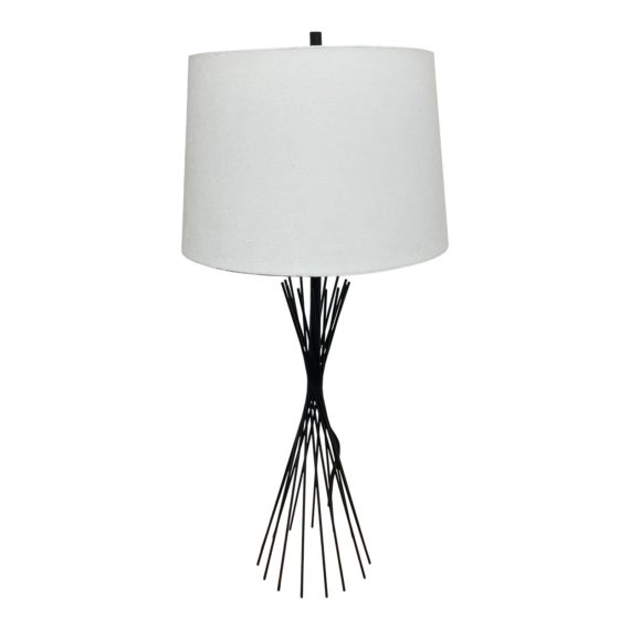 Design Plus Gallery presents a Contemporary Black Metal Sculptural Table Lamp. Black powder coated metal is arranged in a dynamic fashion. A simple white fabric barrel shade balances the sculptural base, and the finial coordinates with the metal. Minor wear through out, table lamp is in good condition.