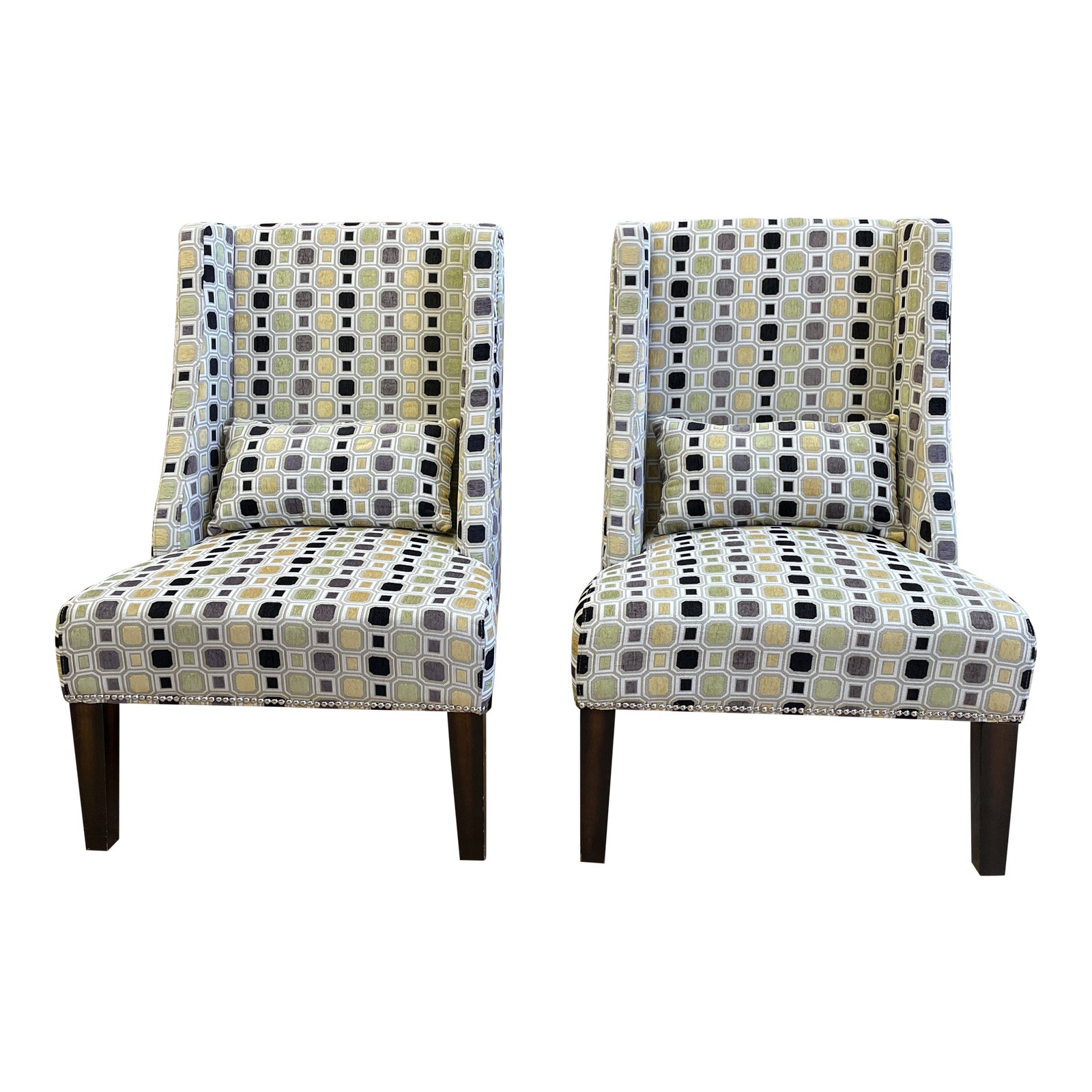 Design Plus Gallery presents a Pair of Contemporary Bold Hollywood Regency Wingback Chair. Classic Mid century pattern is given a fresh update with light colors in a bold and graphic black and champagne synthetic blend. Chrome nail head adds a little shimmer to the stately and statuesque silhouettes. Seats are fixed and come with coordinating lumbar pillow. Legs are a modern black wood tapered form. Minor wear, good condition.