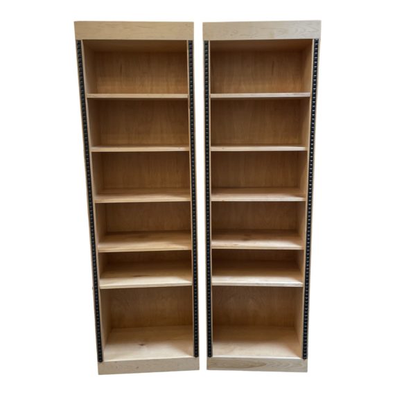 Design Plus Gallery presents a Pair of Contemporary Bookshelves. The natural wood pair are detailed with contrasting black dentil trim. Six fixed shelves offer tons of storage and display space.