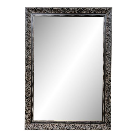 Design Plus Gallery presents the Contemporary Dark Rubbed Bronze/Black Finish Mirror. A rectangular mirror is framed in a bronze frame. The frame is finished in black and features two accents; a trail of dots on the inner frame, and a floral pattern on the outer frame. Minor wear from age and use; mirror is in good condition.
