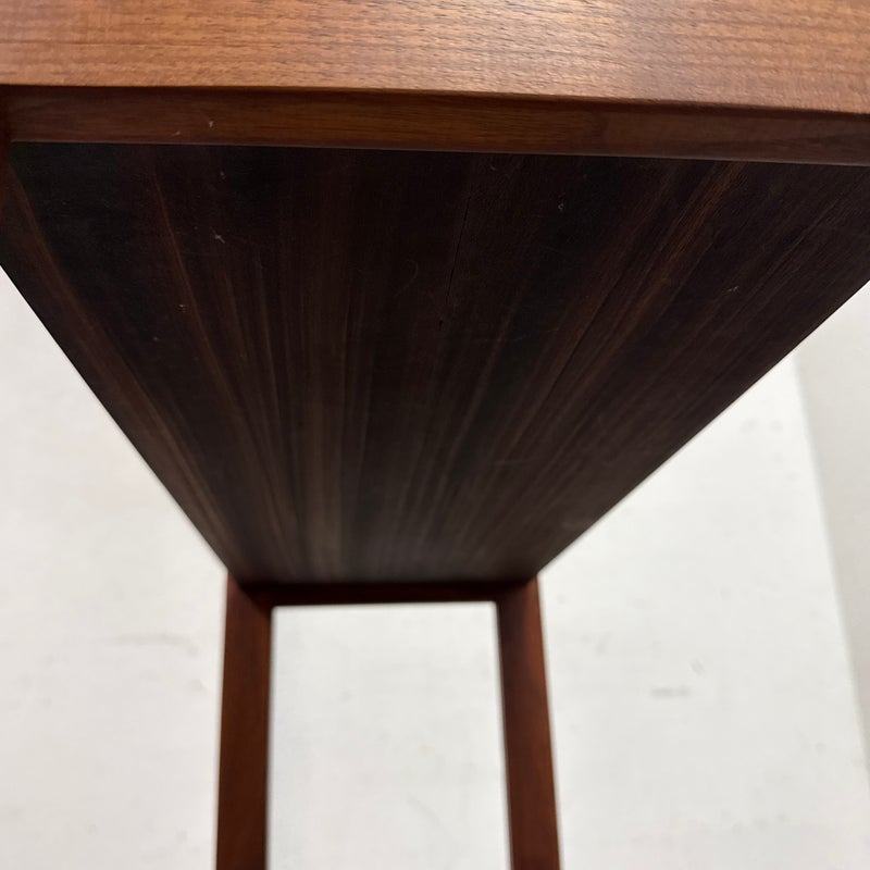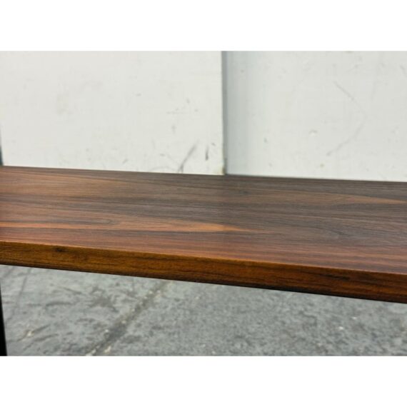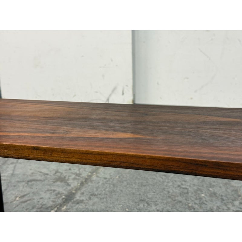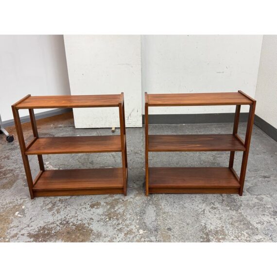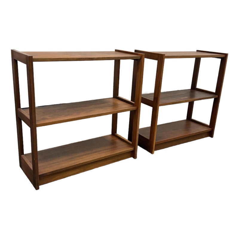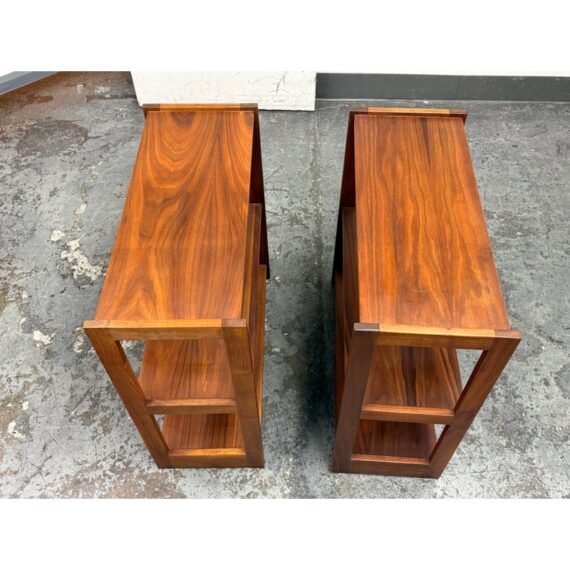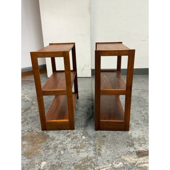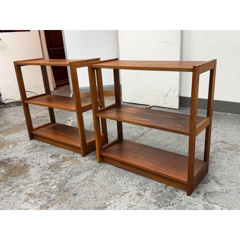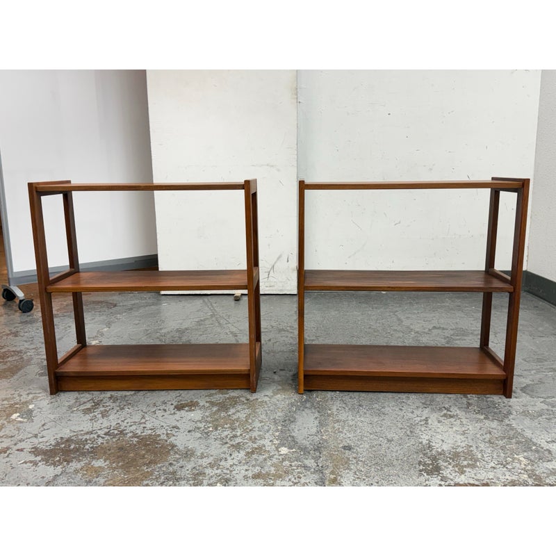 Design Plus Gallery presents a Pair of Dual Tiered Book Shelves in a Contemporary Style. These shelving units have two tiers for stacking all your books in an organized fashion. They are sturdy and offer a dark walnut stain. Overall the shelving units are in good condition with visible wear that is consistent with usage.