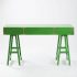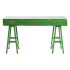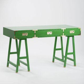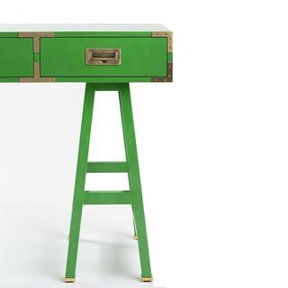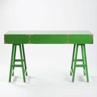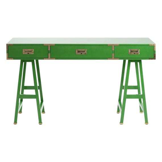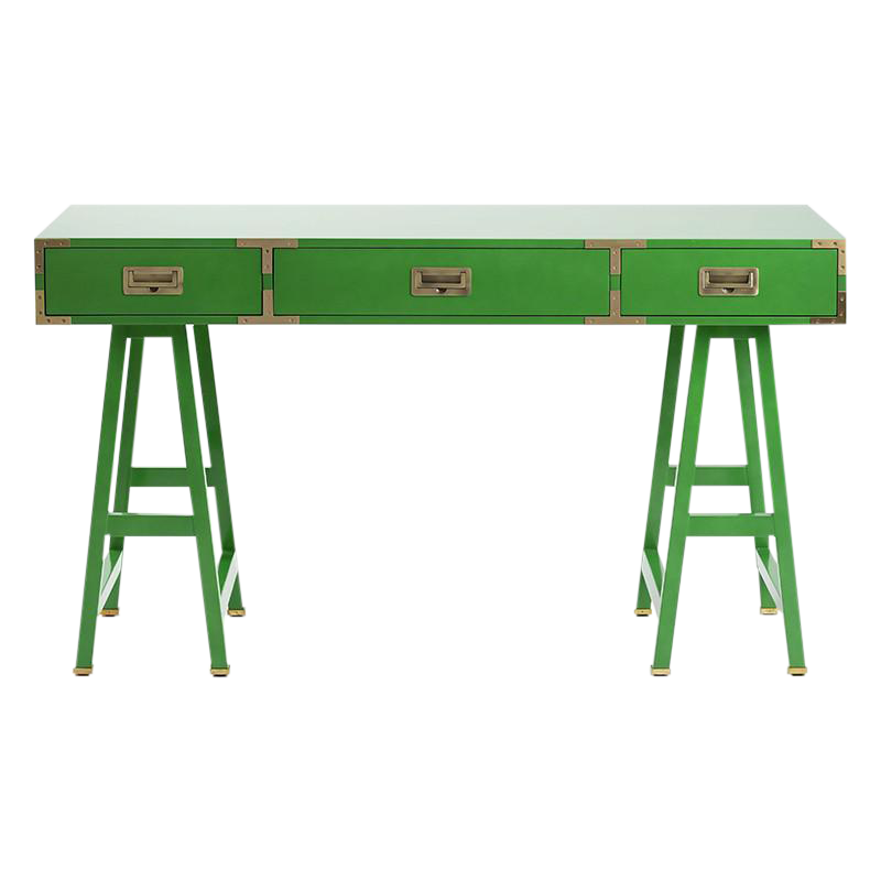 Design Plus Consignment Gallery has a brand new emerald accent desk. Straight from a designer showroom in the San Francisco Design Center. This particular emerald accent desk is a fun and design-forward expression of our love of color. This desk is a wonder of functionality and forward thinking design. The desk top has three large drawers with brass pull out handles. The brass bracing finishes the look. The piece is constructed of gemolina solids, thickly coated in lead-free emerald green lacquer. The drawer floral inserts are removable to show a green lacquer drawer. Showroom Retail Price: 1,950.00