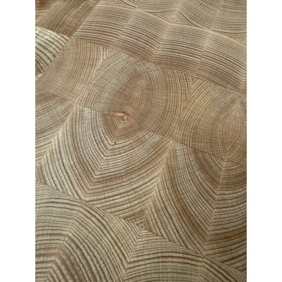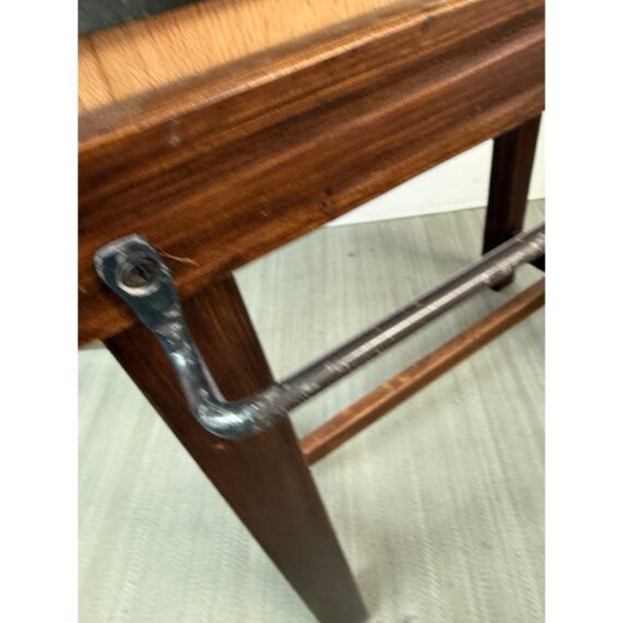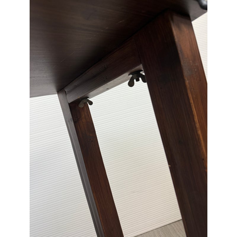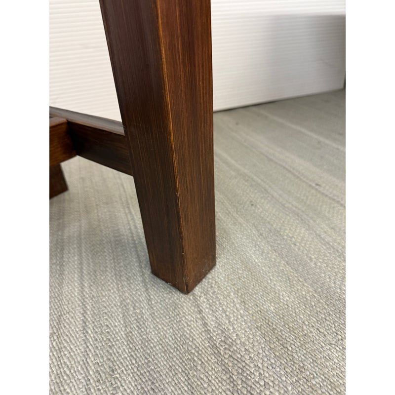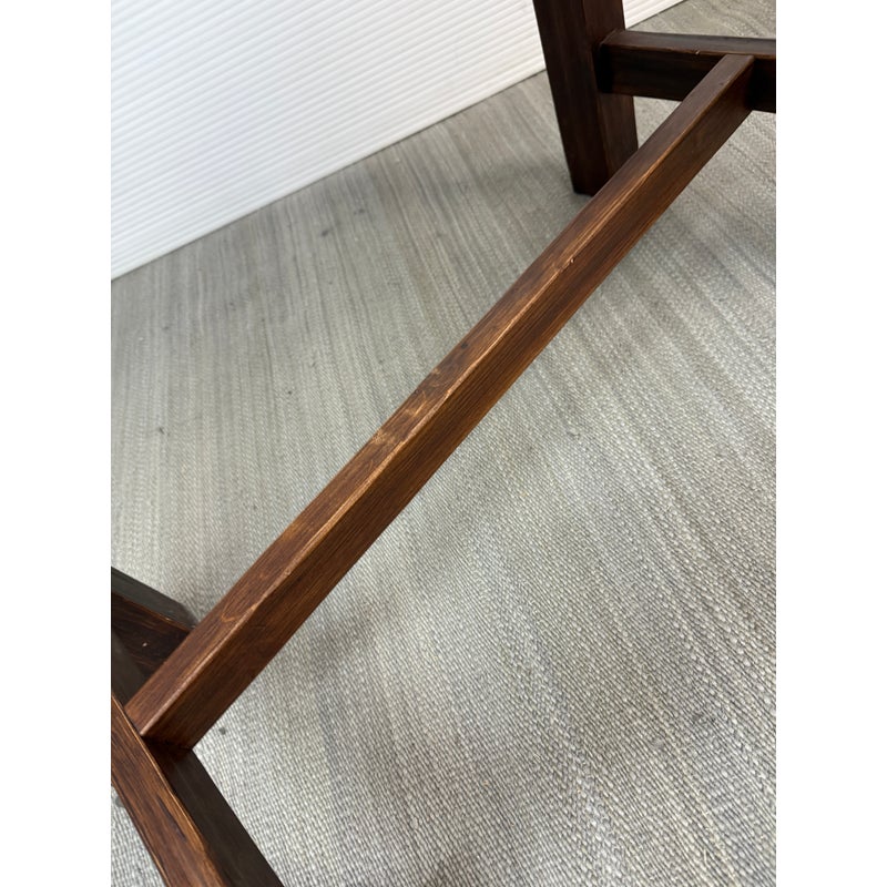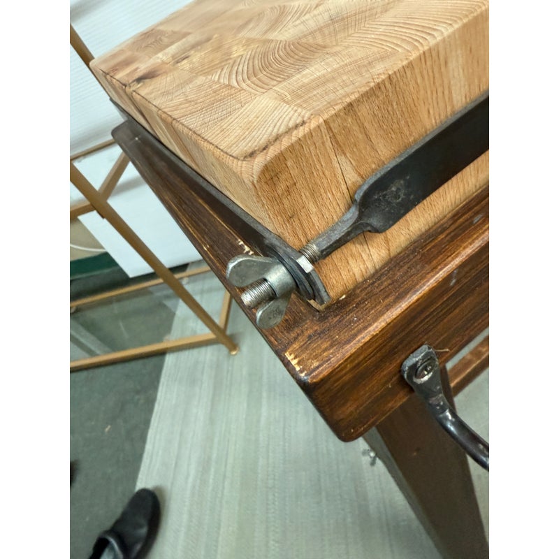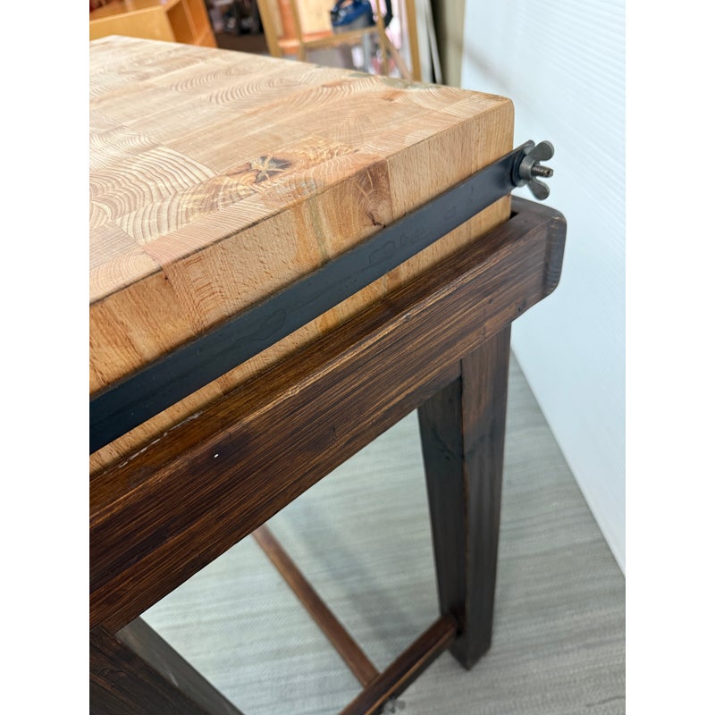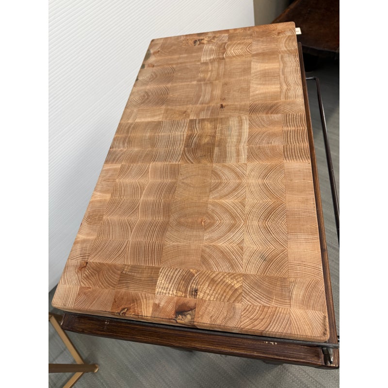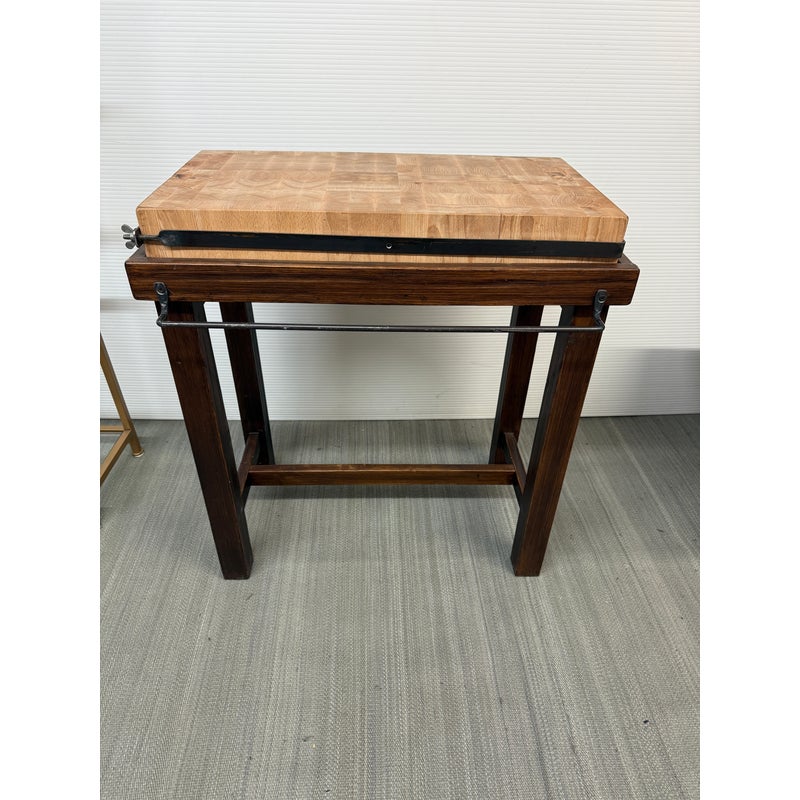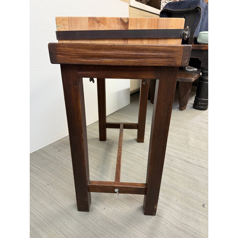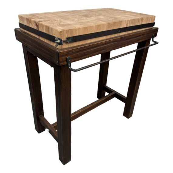 Design Plus Gallery presents a Kitchen Island that Doubles as a Functioning Butcher’s Block. The island has dark stained wooden base that elevates a thick slab of end grain butcher block. An iron band wraps around the grained wood. There is a convenient iron rail for hanging tools/towels, etc. Light surface wear; good condition.