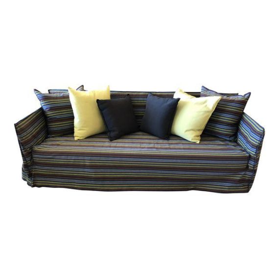 Design Plus Gallery presents the Ghost Sofa, by Gervasoni. An unconventional silhouette, the Ghost sofa is comfortable and boldly striped slipcover is snug. Constructed of a solid wood frame, with elastic belts, upholstered with polyurethane foams, removable/replaceable covers. The sofa also comes with six toss pillows in Dacron and down.