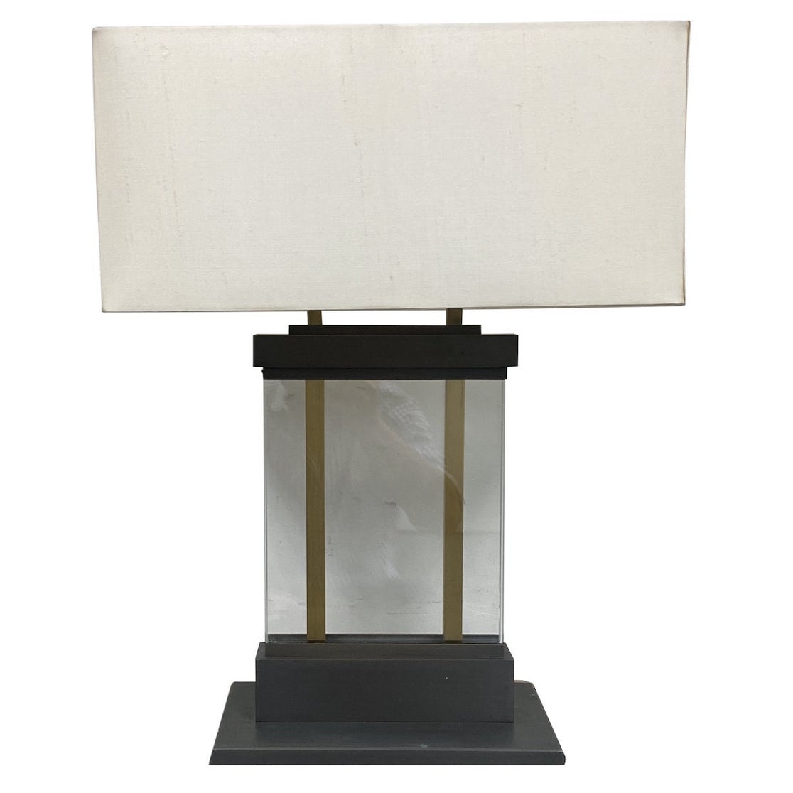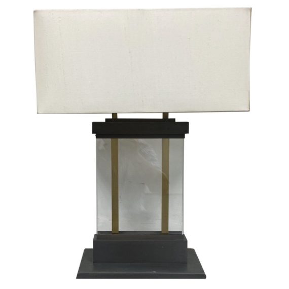 Design Plus Gallery presents a Glass + Brass Iron Anvil Table Lamp. Double layering of glass is suspended between solid satin iron tiered anchors. Oiled brass bars span within the glass to connect to the double bulb header. Silk ivory shade emulates the narrow proportions of the base. Ideal for contemporary soft lighting needs in tight spaces. Minor wear on surfaces.