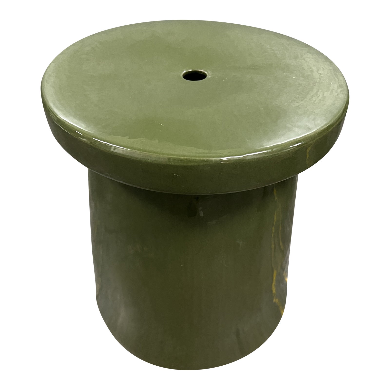 Design Plus Gallery presents a Green Ceramic Garden Stool. A hole on top gives drainage to the sculptural + modern form. The green is a light and dusty tone. There is minor wear through out, stool is in good condition.