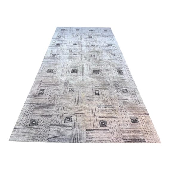 Design Plus Gallery presents a Large Contemporary Grey Wool Area Rug of 8 x 14 Feet. The rug has striations of concentric lines that form a square repeatedly. The colors are of light gray and ink black. The rug has visible wear and would do well with a professional cleaning.