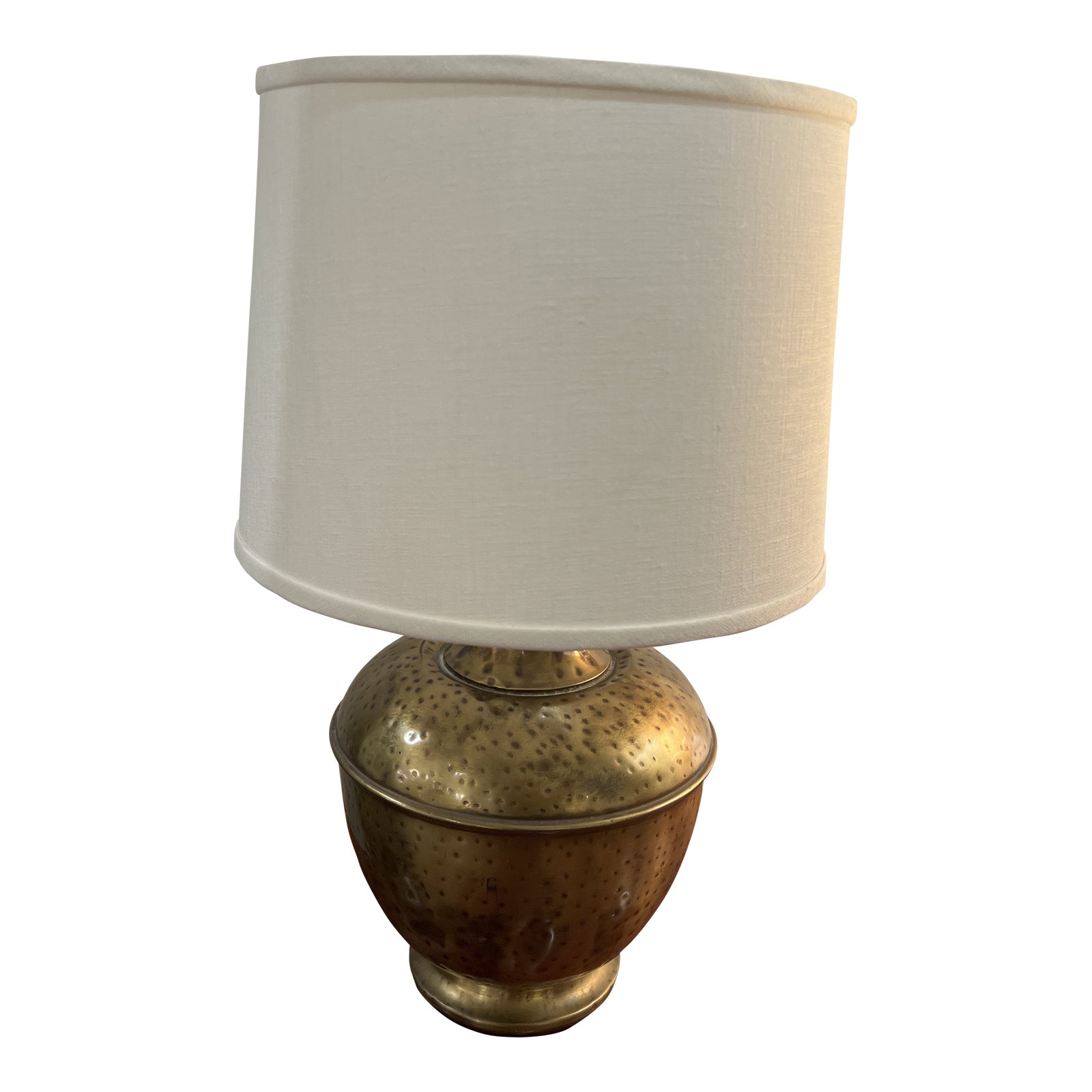 Design Plus Gallery presents a Contemporary Hammered Brass Base Table Lamp. Brass urn formed base has a lovely hammered texture and enchanting reflective quality. The shade balances with a light linen in a contemporary barrel shape. There is minor wear through out, table lamp is in good condition.