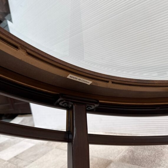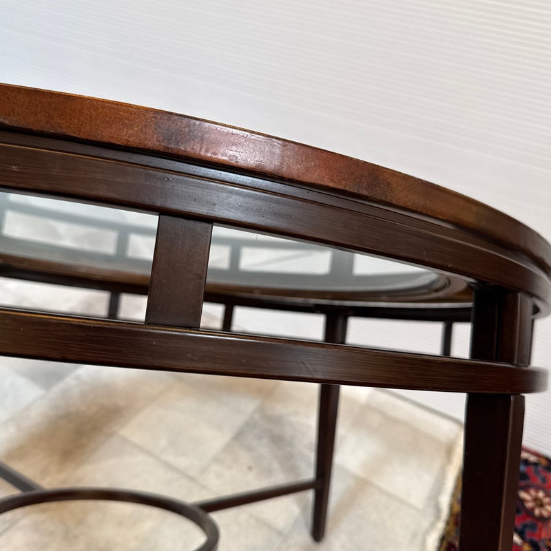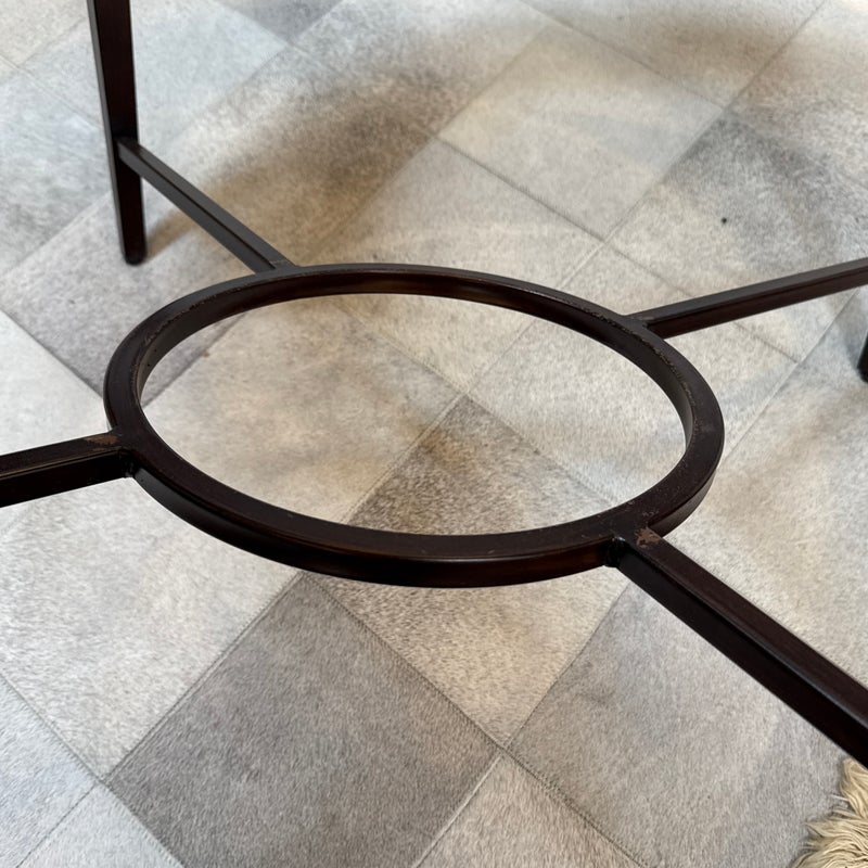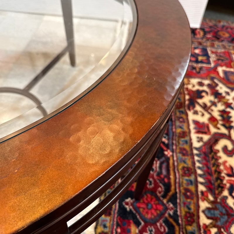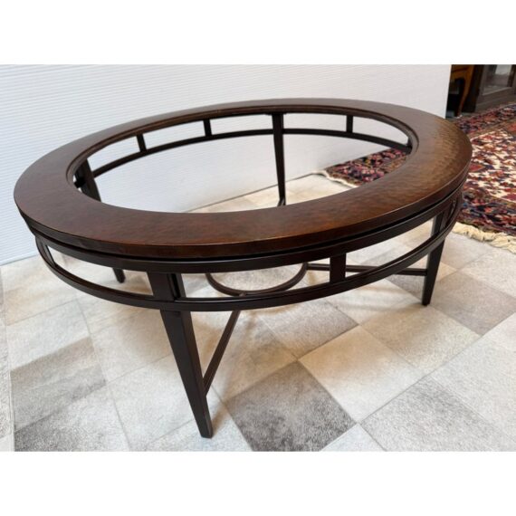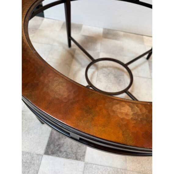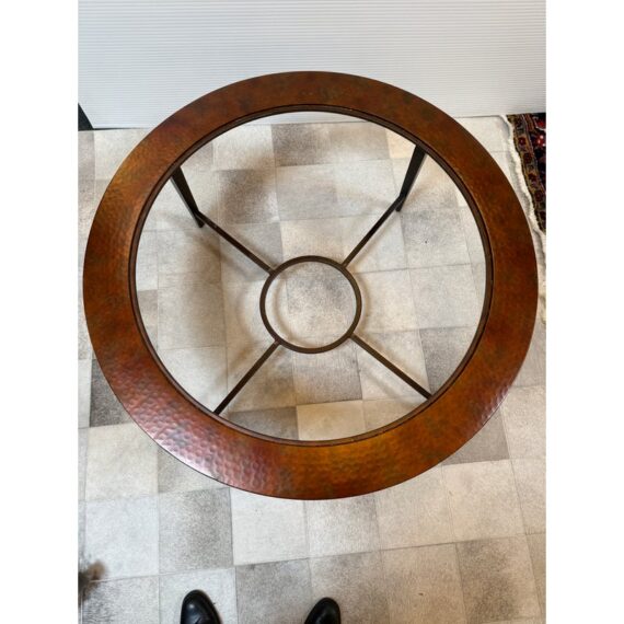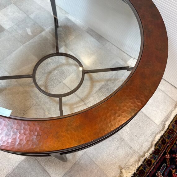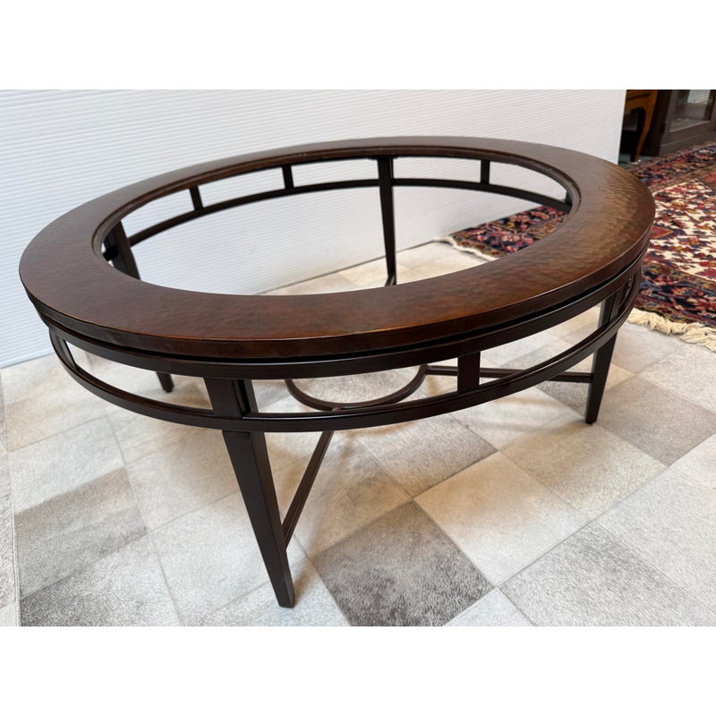 Design Plus Gallery presents a Contemporary Coffee Table. The round coffee table offers a hand hammered copper ring that is inset with clear glass that creates an inviting centerpoint in your living space. The dark wood frame base has an open apron with circular center brace and tapering legs. The non-beveled glass top completes the casually elegant style. Minor wear consistent with age and use.