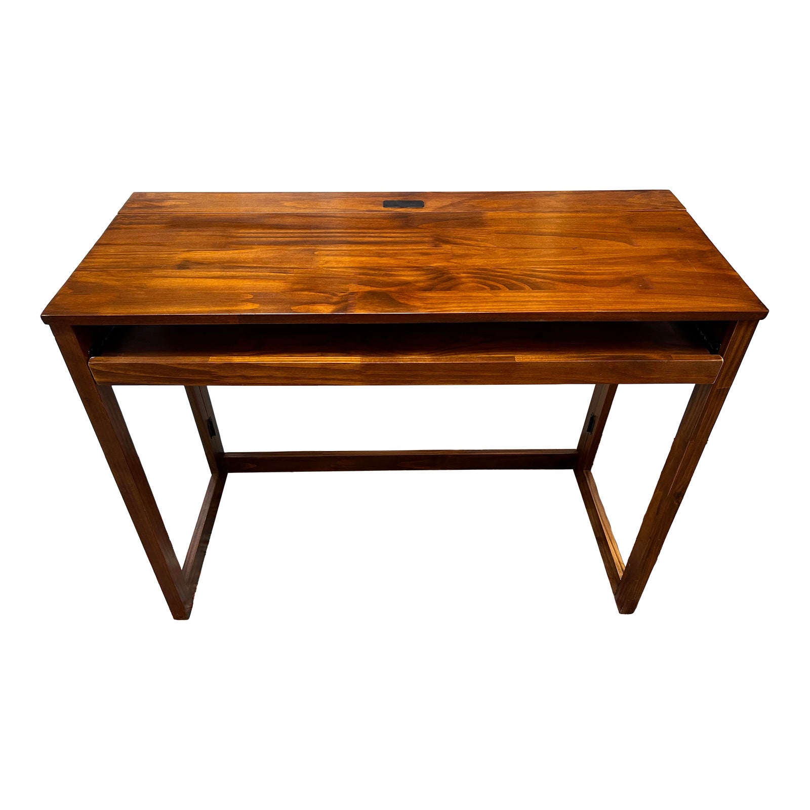 Design Plus Gallery presents a Hideaway Desk. When open, this desk is crafted in sturdy pine with a spacious top to hold a laptop, supplies and more. It has a pullout shelf or keyboard and mouse. The Desk can fold up flat and hide away in a closet of under a bed. It has 4 USB charging ports inset in the top surface. Compact and functional. Light evidence of surface wear; overall good condition. Made in Thailand.