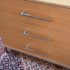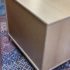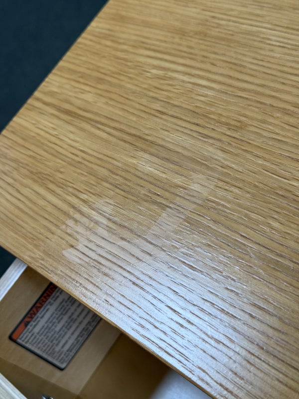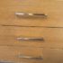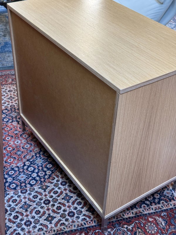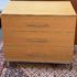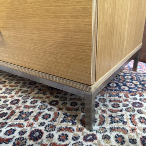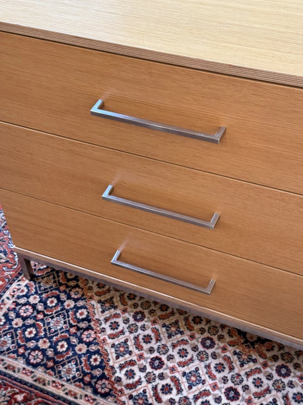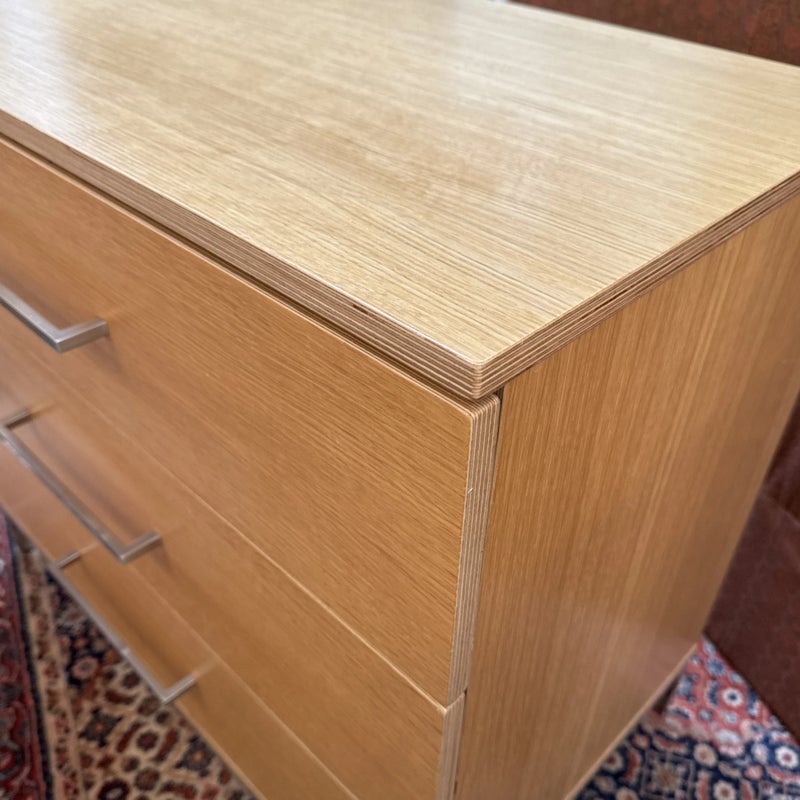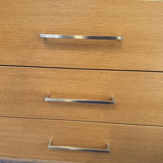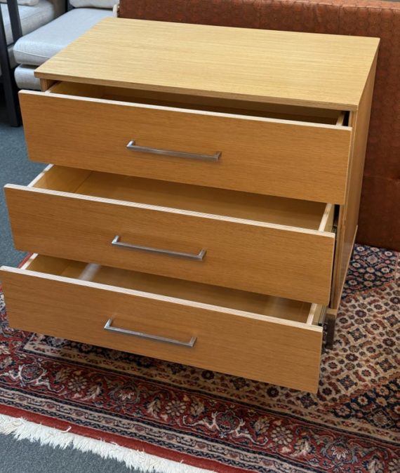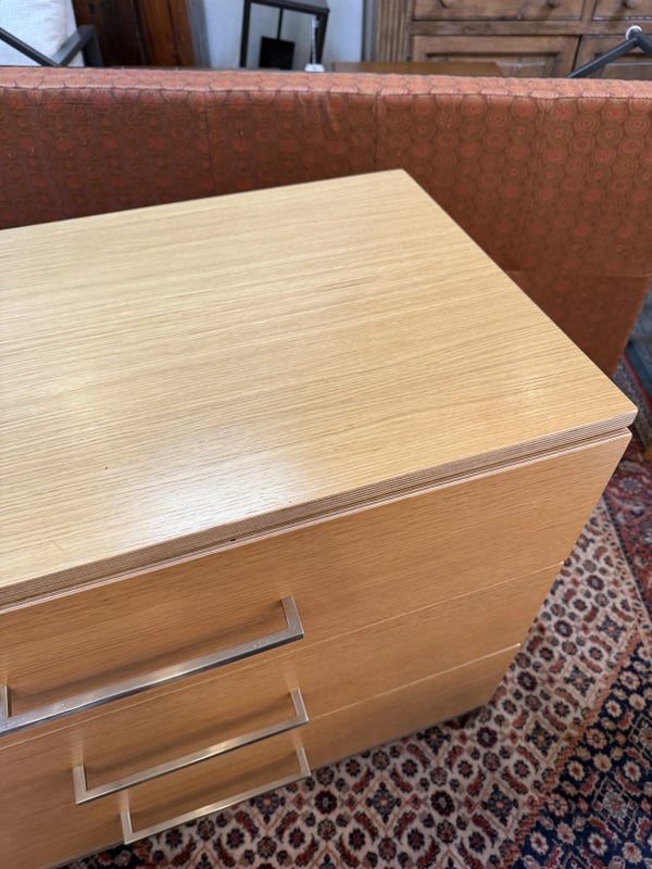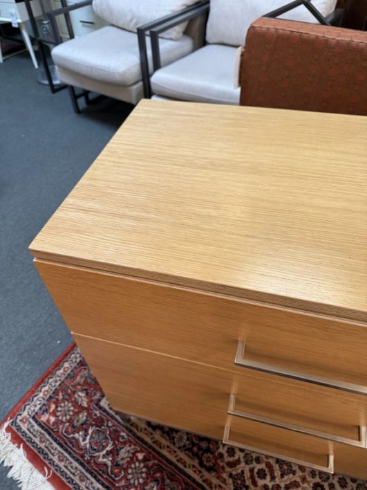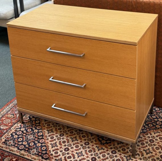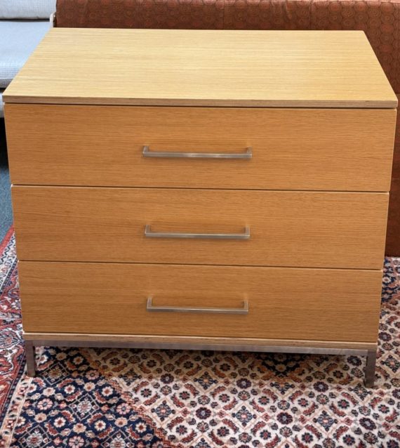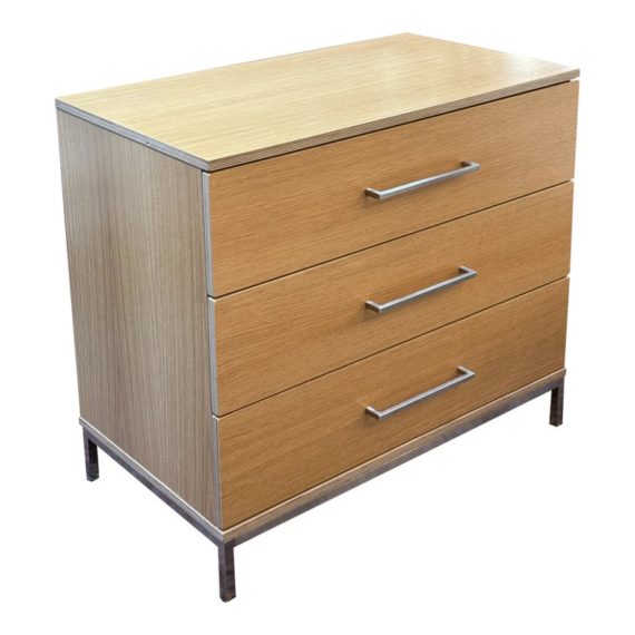 Design Plus Gallery presents a Linear Style Contemporary 3 Drawer Dresser. The simple silhouette houses three deep storage drawers within the laminate wood frame. Large stainless handles and base brings contemporary style. Light surface wear; spill stain on top; condition is fair for age and use.