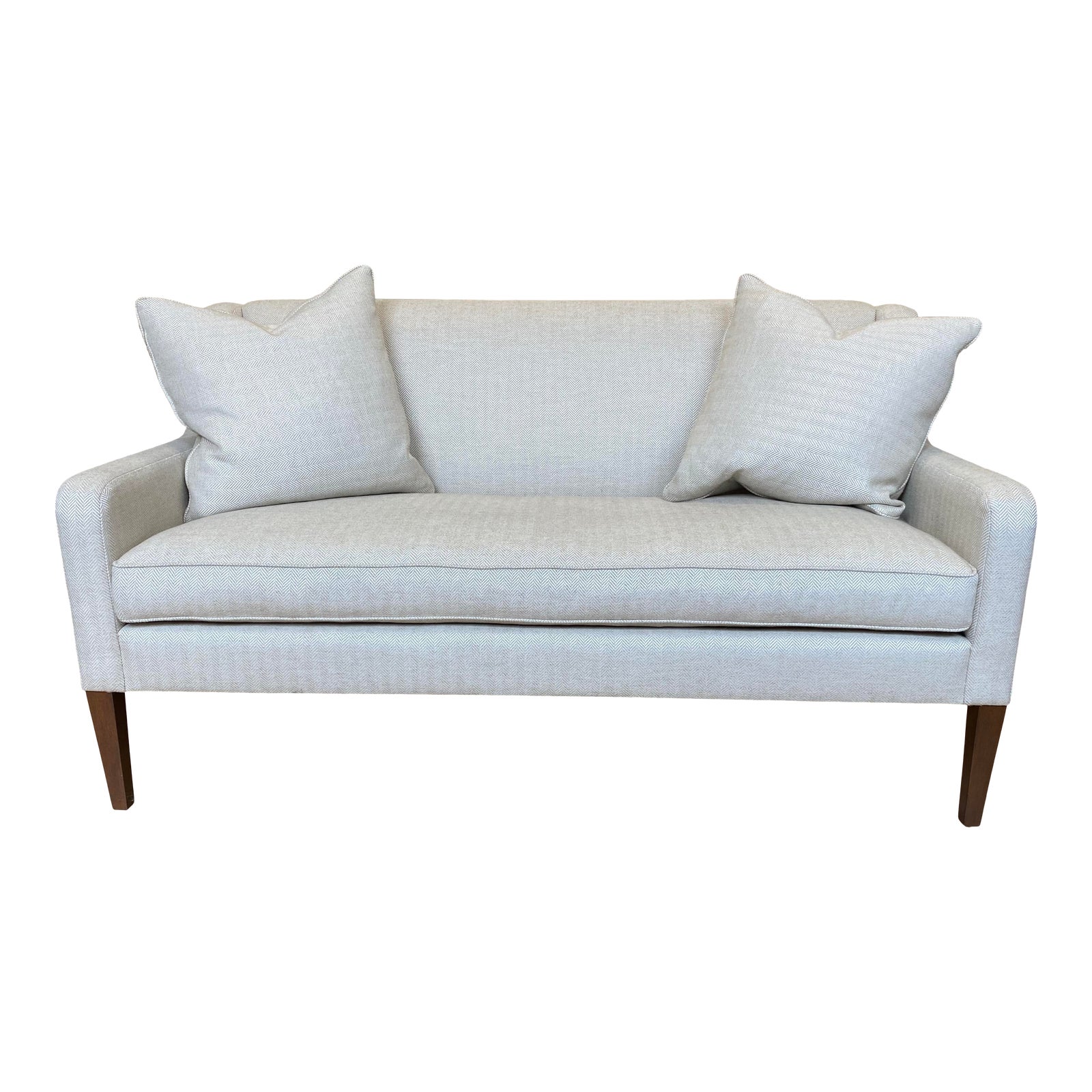 Design Plus Gallery presents a Ivory Loveseat. Small scale loveseat features transitional details like sloped arms, decorative matching cushions, a welcoming bench seat and tapered Chestnut legs. Little evidence of wear. Fabric is an ivory and beige mix of fibers in a densely patterned chevron like repetitive motif. Back is fixed. Bench and pillow cushions are finished with a cable welt.
