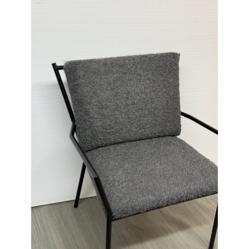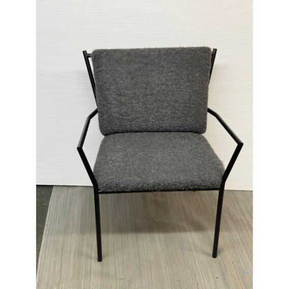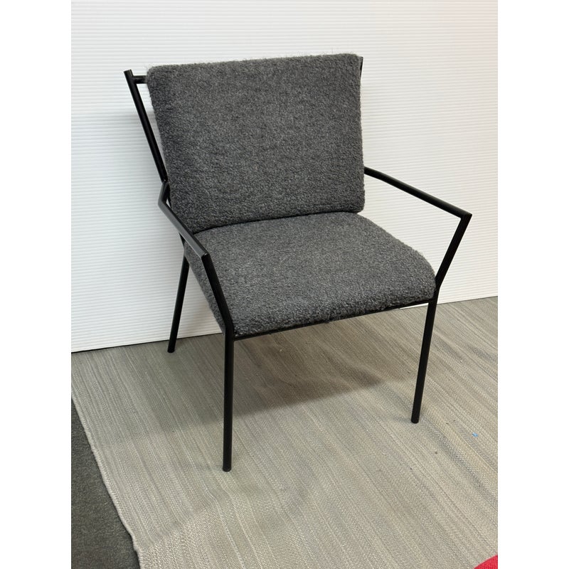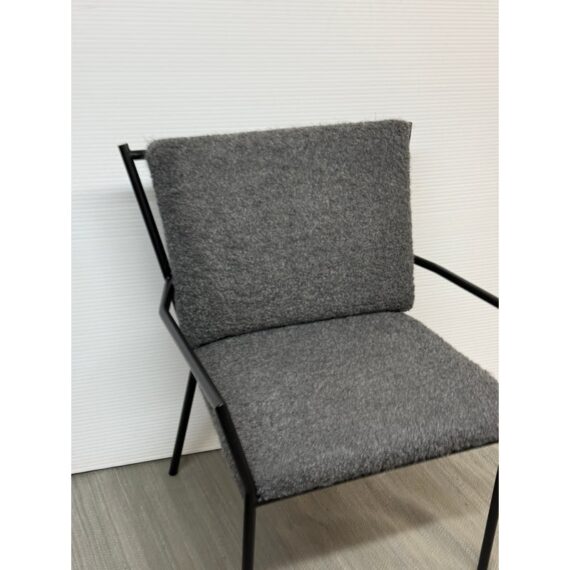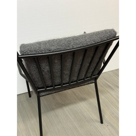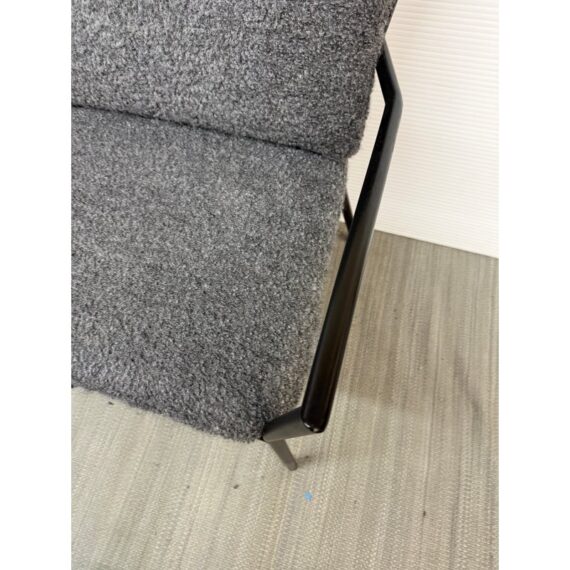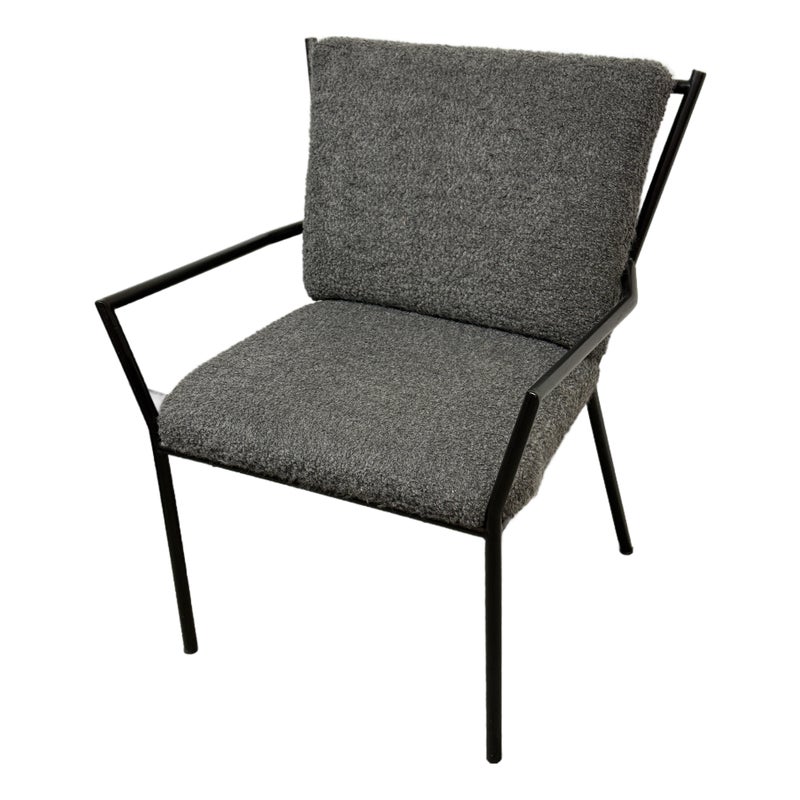Design Plus Gallery presents a Contemporary Arm Chair. Strikes a confident silhouette with its flared arms and modern profile. The frame is crafted from tubular metal and finished in a black matte powder coat, lending an urban edge and durability to the design. For comfort, a loose seat and back cushion—upholstered in a soft gray fabric—offer a plush, inviting resting place, while maintaining a clean-lined look. The gently slatted back introduces subtle visual interest and ensures breathability. Makers brand is unknown. In good condition, visible and minimal wear.