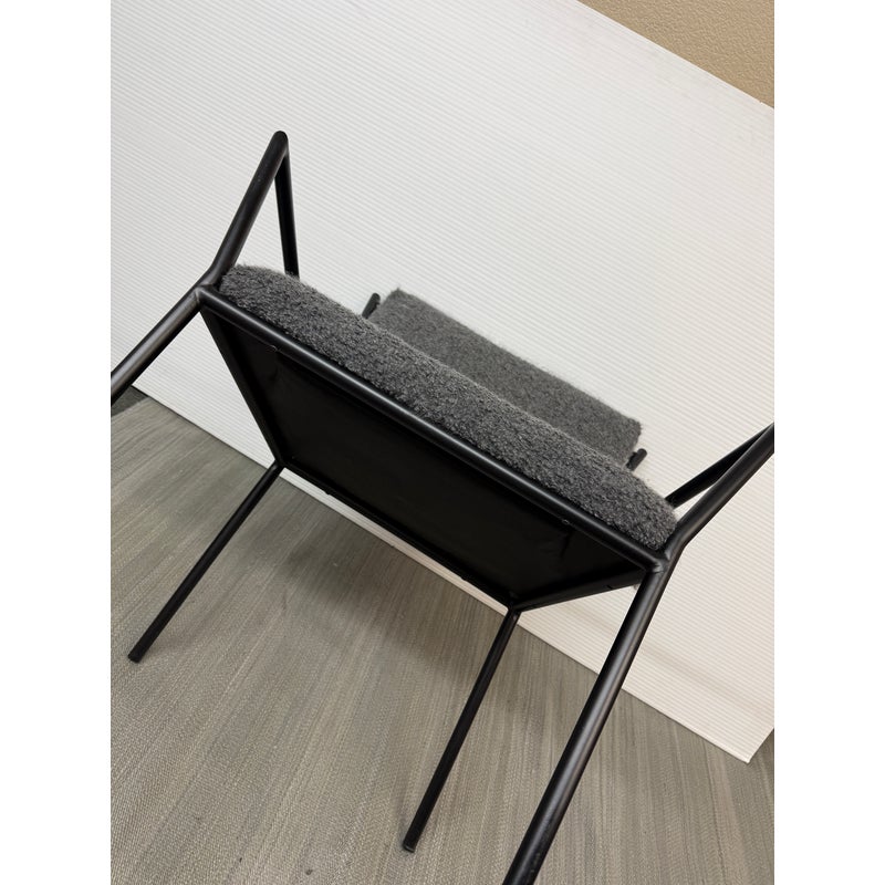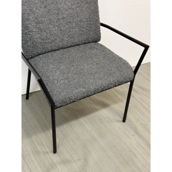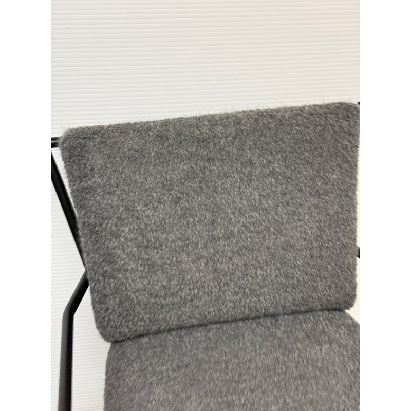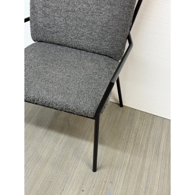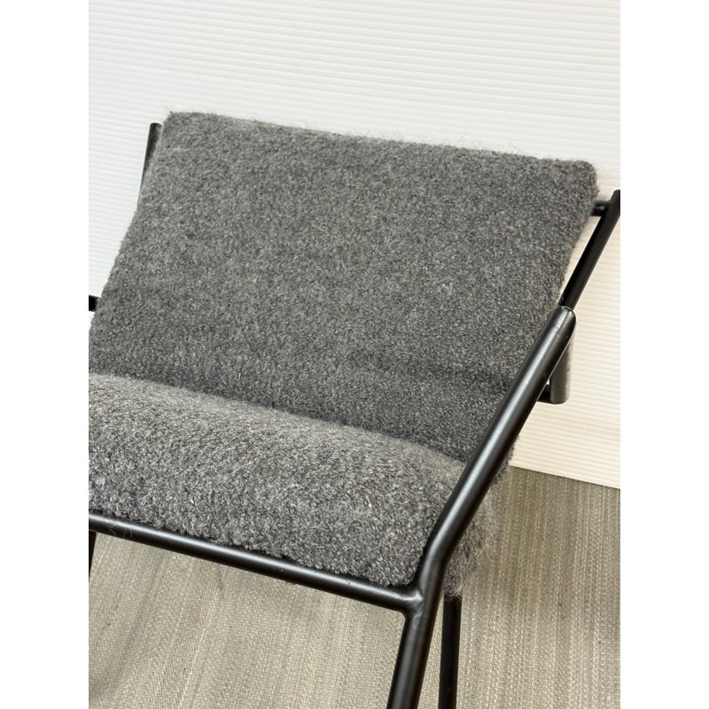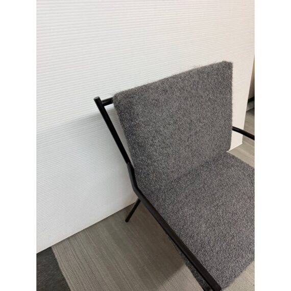 Design Plus Gallery presents a Contemporary Arm Chair. Strikes a confident silhouette with its flared arms and modern profile. The frame is crafted from tubular metal and finished in a black matte powder coat, lending an urban edge and durability to the design. For comfort, a loose seat and back cushion—upholstered in a soft gray fabric—offer a plush, inviting resting place, while maintaining a clean-lined look. The gently slatted back introduces subtle visual interest and ensures breathability. Makers brand is unknown. In good condition, visible and minimal wear.