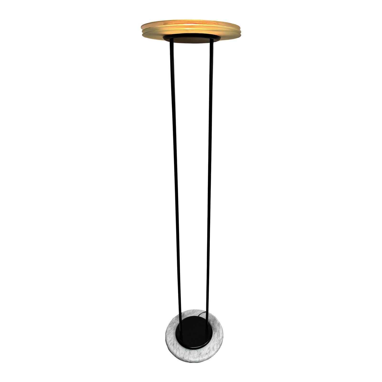 Design Plus Gallery presents a Contemporary Torchiere Floor Lamp. Anchored by a thick round of marble, black powder-coated metal rods elevate several glass discs to illuminate your space vertically. Light surface wear; condition is good for age and use.