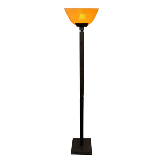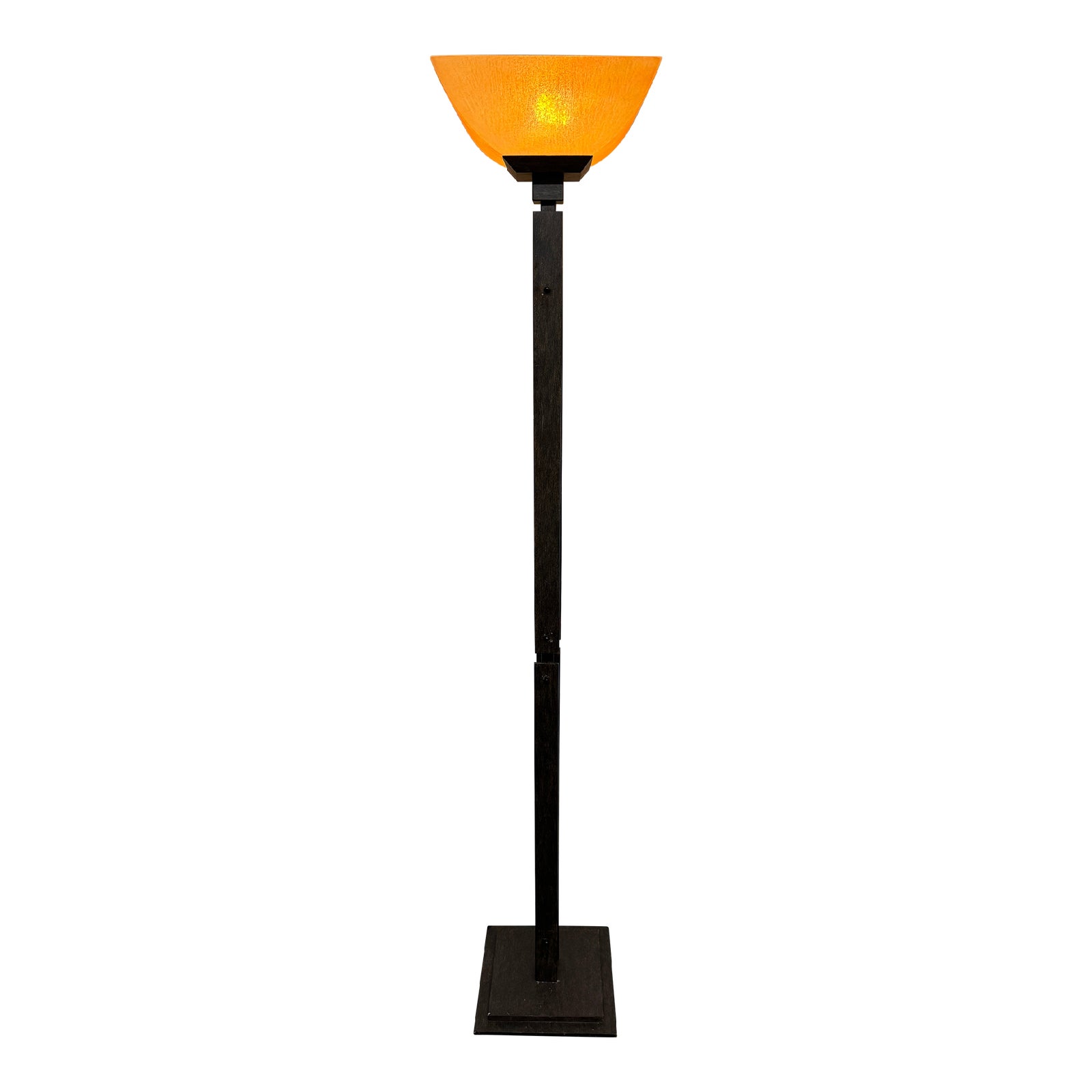 Design Plus Gallery presents a Contemporary Torchiere. This striking floor lamp keeps a contemporary silhouette, in faux wood finished metal, rising from a stepped square base. A softly curving trapezoid frosted glass shade directs light upward for warm and welcoming ambient lighting. Light surface wear; condition is fair for age and use.
