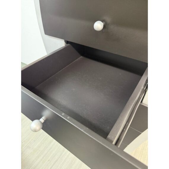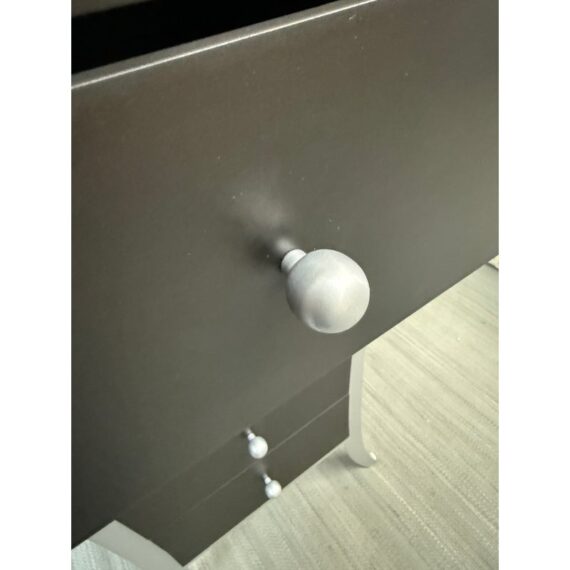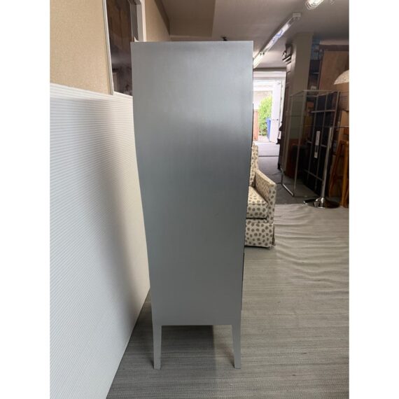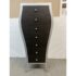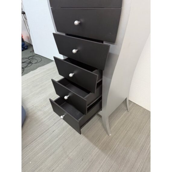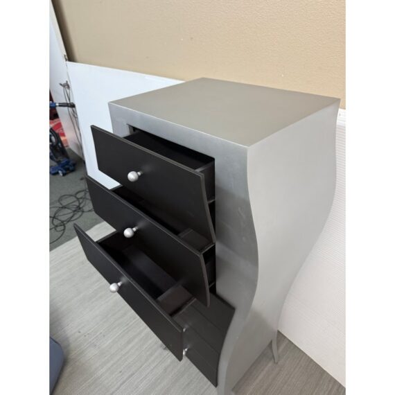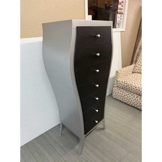 Design Plus Gallery presents a Contemporary Lingerie Chest. The undulating metal case, in silver powder coat paint, holds seven shallow drawers for lingerie or treasures. Each black drawer, all the same size, has a brushed stainless pull. Light surface wear; condition is good.