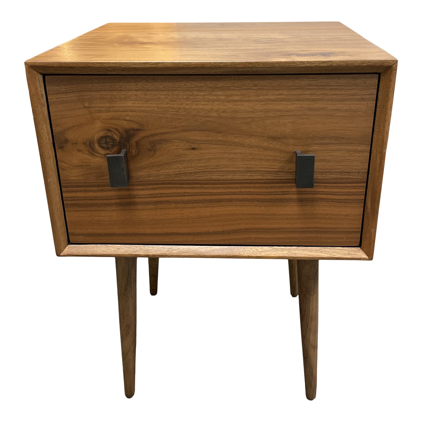Design Plus Gallery presents a Contemporary Mid Century Modern Walnut Finish Nightstand. Inspired by the Mid 20th century designs. One single drawer offer generous interior space with accented modern metal hardware. Hardware is a dark espresso tone. Four tapered legs give an airy lift to this nightstand which can also easily double as a side table. Visible wear, good condition. Walnut veneers have a dramatic grain and gives an organic modern vibe.