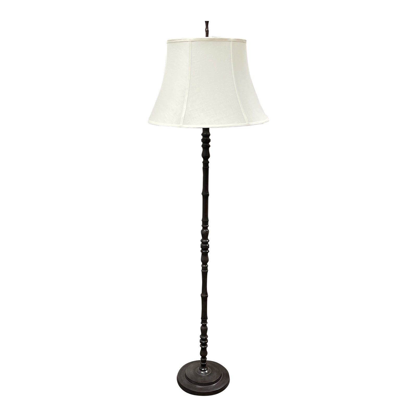 Design Plus Gallery Presents a Contemporary Mini Chocolate Longshan Floor Lamp. This lamp has a sturdy metal base with light detailing, and a classic simple shade. This lamp is in good condition with minor wear from age. This classic design makes it an easy addition to your space.