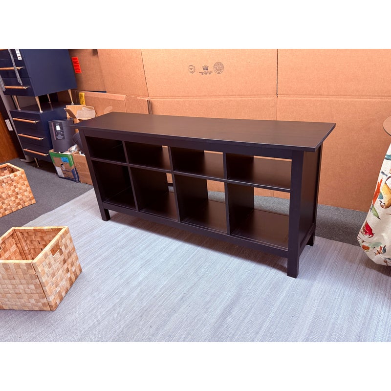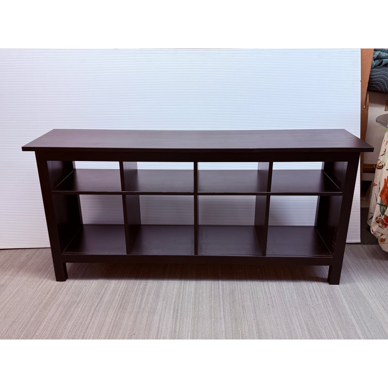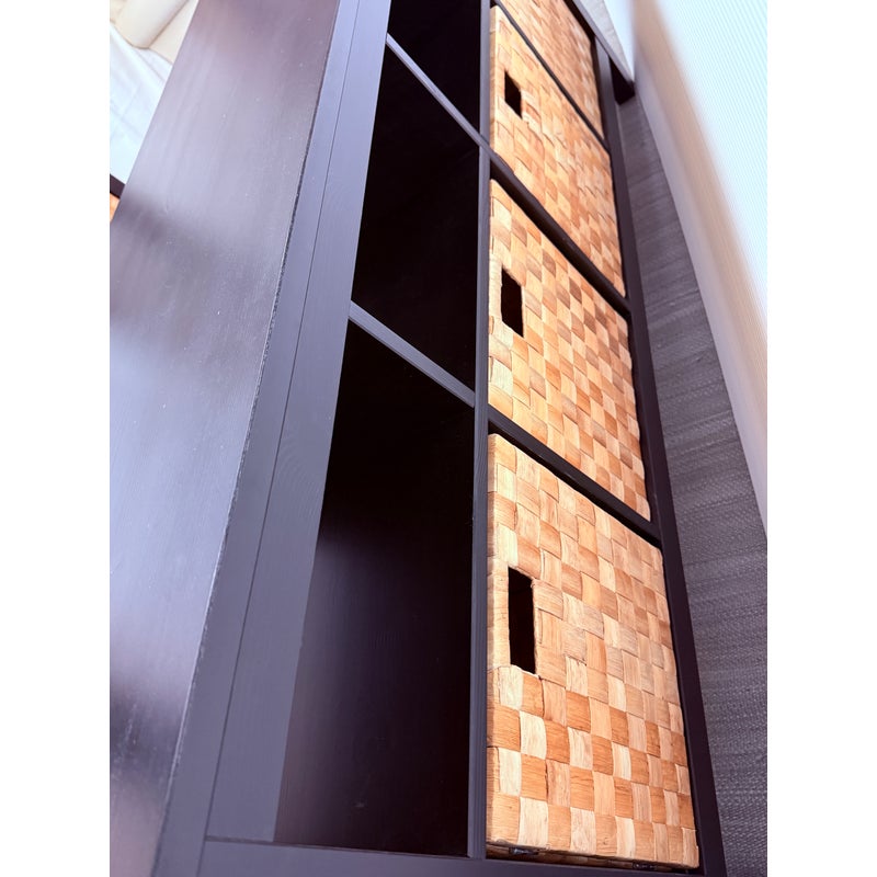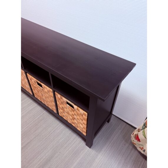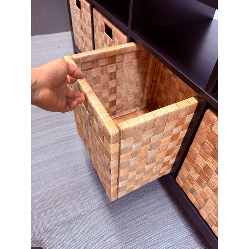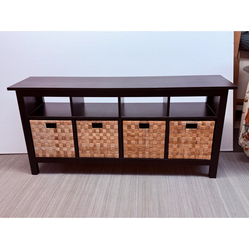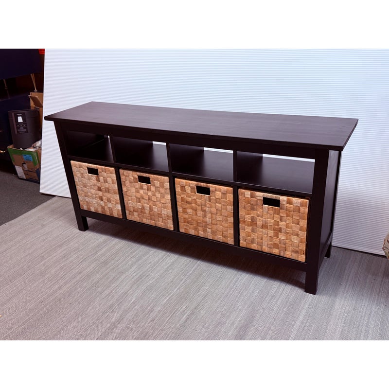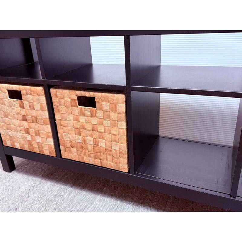 Design Plus Gallery presents an Open Cubby System with Woven Baskets. The cubby has a dark wood frame and allows for convenient storage. It has four baskets that fit perfectly into the shelving for versatile organization for media, books, or entryway storage, In good condition visible and lived in wear.
