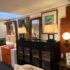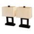 Design Plus Gallery presents a Pair of Contemporary Table Lamps. They have a slender depth with wide presence. The base of each is like an open middle of a square shape in a burnished brass tone. There are proportioned shades in a cream color of linen with matching finials to the body. They are in good condition, minimal wear for their usage.