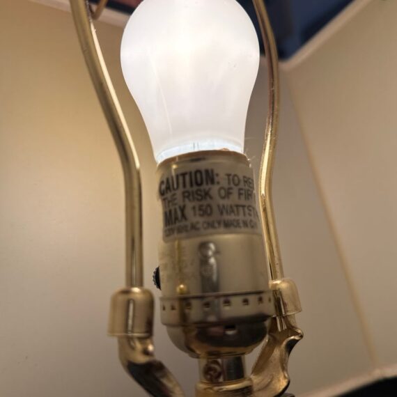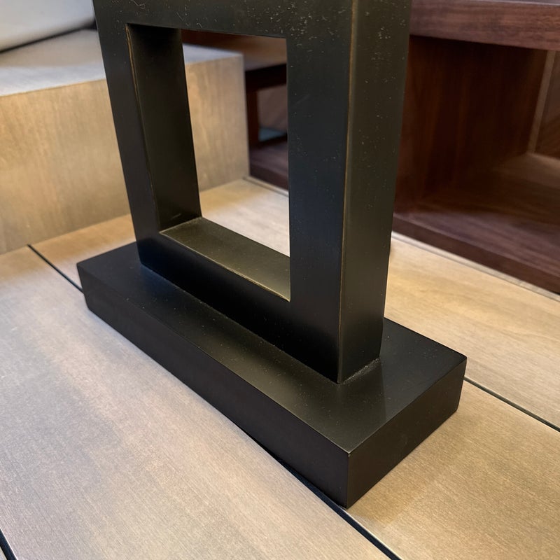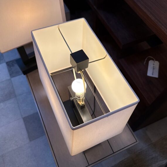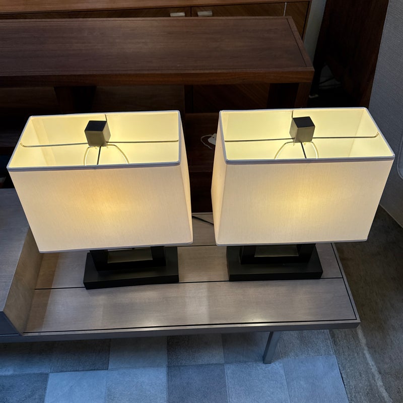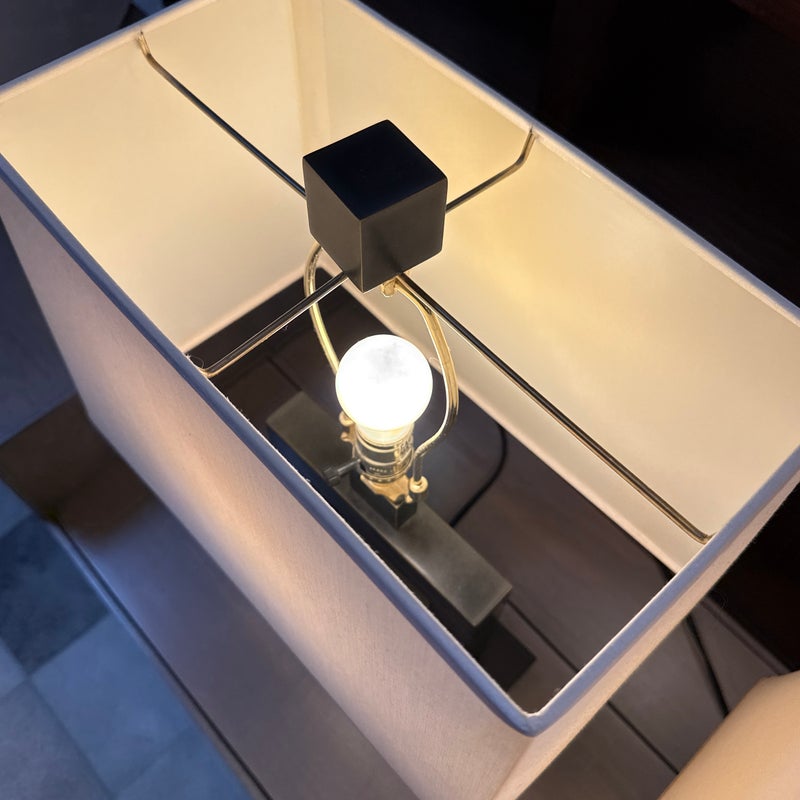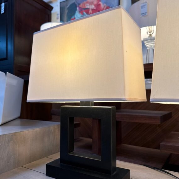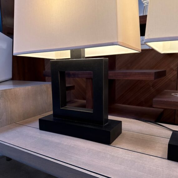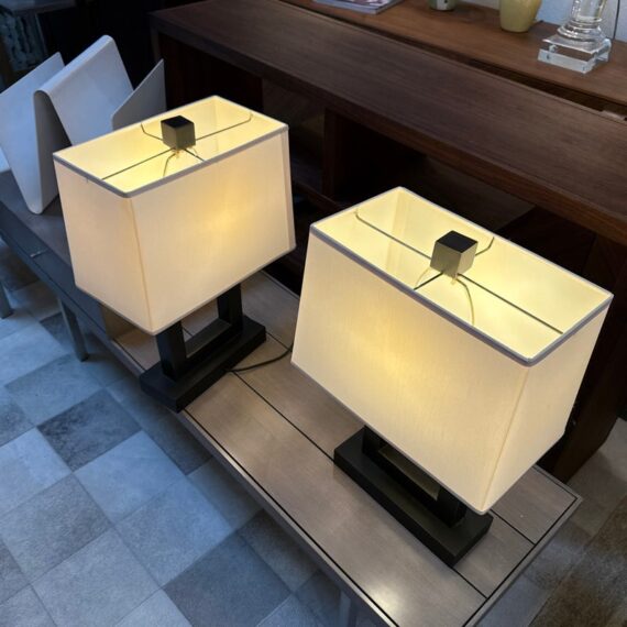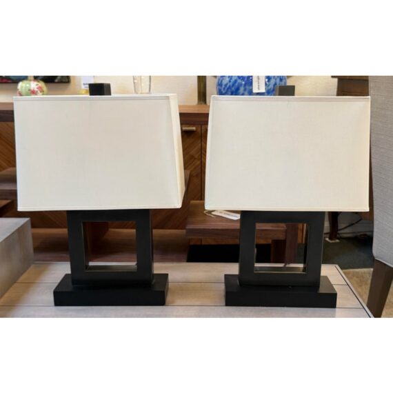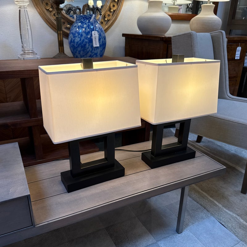 Design Plus Gallery presents a Pair of Contemporary Table Lamps. They have a slender depth with wide presence. The base of each is like an open middle of a square shape in a burnished brass tone. There are proportioned shades in a cream color of linen with matching finials to the body. They are in good condition, minimal wear for their usage.