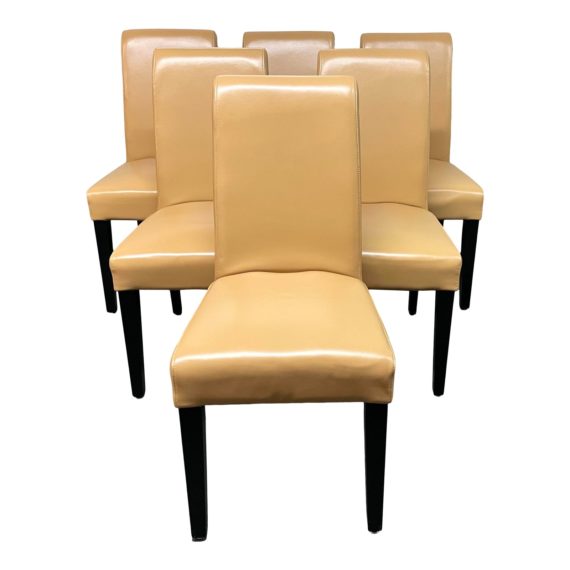 Design Plus Gallery presents a Set of Six Contemporary Peach Bonded Leather Dining Chairs. Curved sleigh back offers plenty of support with a high density foam padding underneath. Bases constructed of a dark stained wood finish. Visible wear through out, good overall condition.