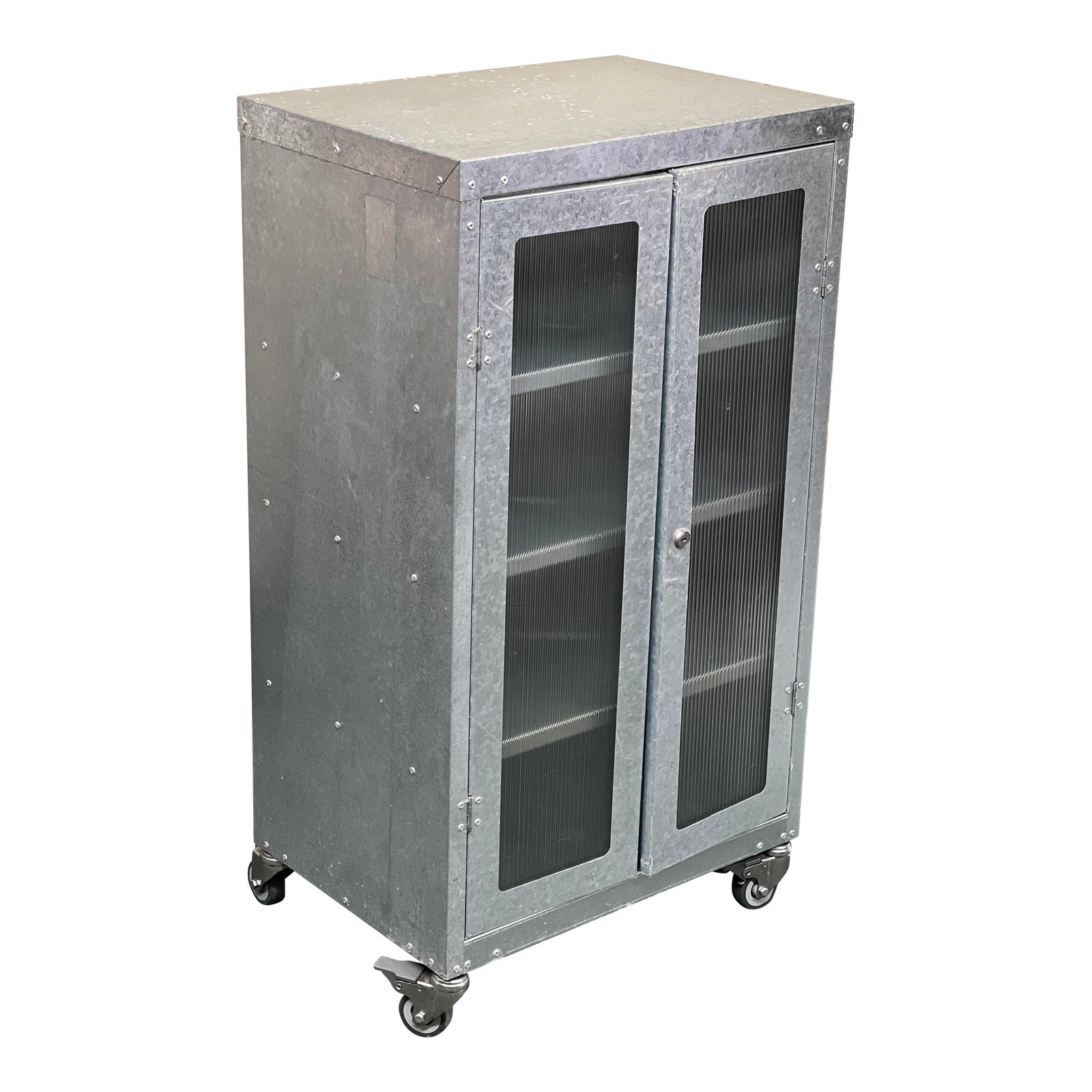 Design Plus Gallery presents a Contemporary Rolling Metal Storage Cabinet. This portable cabinet is constructed with metal and has lockable castors. The doors have glass inserts and open to present three fixed shelves. The body is accented with screws and still has protective film attached. Minor wear consistent with use; cabinet is in good condition.