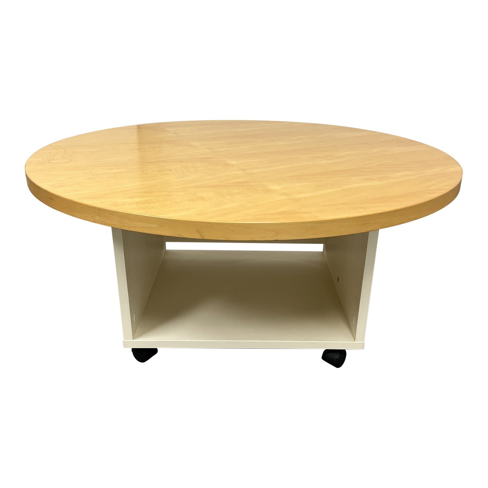 Design Plus Gallery presents a Contemporary Round Maple Finish Coffee Table + Casters. Plastic castors anchors the unit with a cream toned open storage space. Circular top is constructed of a maple veneer. There is visible wear through out, coffee table is in good condition.